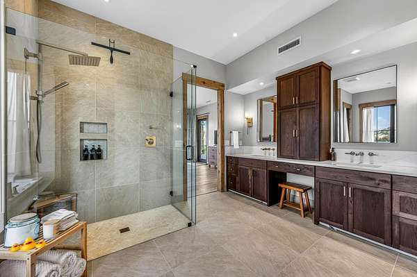- Built-In Features, Ceiling Fan(s), Double Vanity, Dry Bar, Enclosed Toilet(s), In-Law Floorplan, Kitchen Island, Linen Closet, Open Floorplan, Primary Downstairs, Shower/Tub Combo, Smart Thermostat, Soaking Tub, Solid Surface Counters, Stone Counters, Vaulted Ceiling(s), Walk-In Closet(s), Wet Bar, Wired For Data