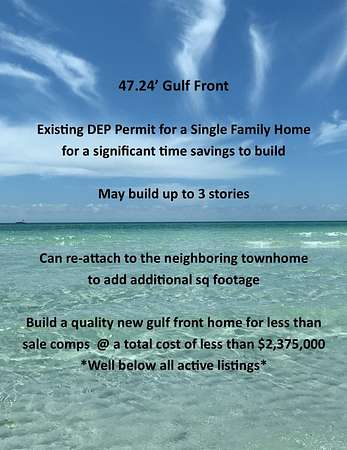 DEP permit is active, with the building footprint, so you can save a year's time before construction. It was recently extended for 3 years. With 47.24 feet of Gulf Front, this deep lot sits far off of Hwy 98, so you won't have to listen to traffic noise. Incredible opportunity to own your beach front property for a fraction of the price of lots not far to the west. The city has said the building can reconnect to the existing units to the east, as a duplex unit, which would increase the building size.