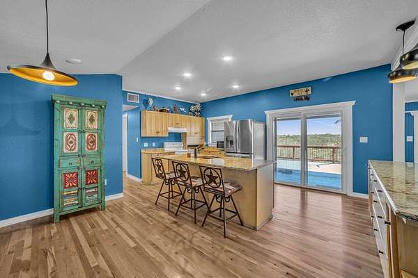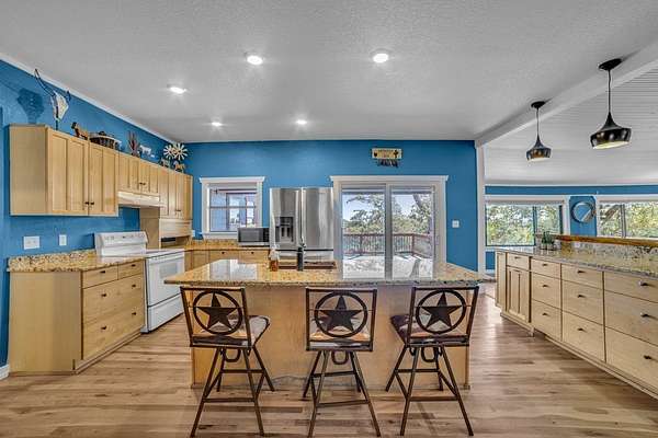 Quiet Country Getaway with Modern Amenities. Escape to this peaceful retreat nestled in nature. The property boasts stunning views of a valley with a wet-weather creek, where a large deck offers the perfect vantage point for birdwatching and wildlife observation. The open-concept great room, featuring floor-to-ceiling picture windows, brings nature indoors. Enjoy cozy evenings by the wood-burning stove, with built-in bookshelves adding a touch of charm. The recently updated kitchen offers modern conveniences, including granite countertops, a center island with a pull-up bar, and a custom cedar natural edge bar, perfect for entertaining or casual dining. This home features two bedrooms plus a flexible library/office space. The master suite includes a spacious closet with Elfa shelving for optimal organization. For added flexibility, the 200 sq ft cabin is equipped with a full bath, kitchenette, and a 300 sq ft screened porch-ideal for guests or as a private retreat. Additional amenities include: Large workshop/barn; Metal two-car carport Newly installed metal roof and AC unit Expansive stone patio; A natural sanctuary for wild cherries, bats, and wildlife. Close to wineries!