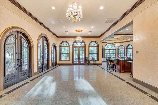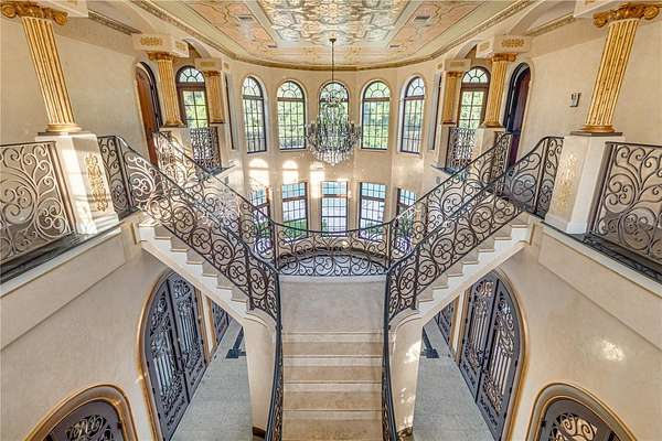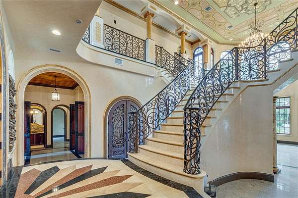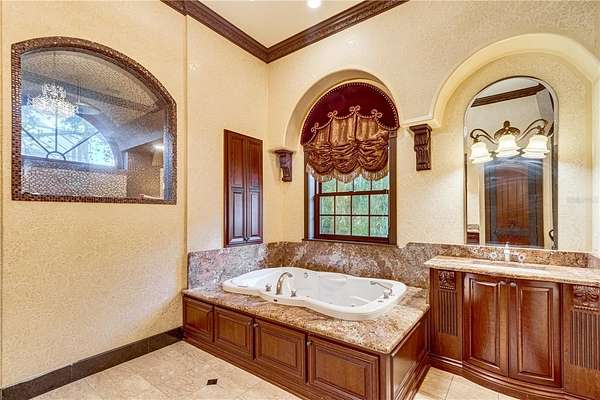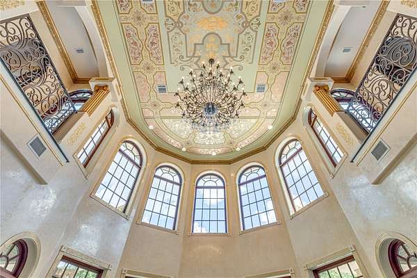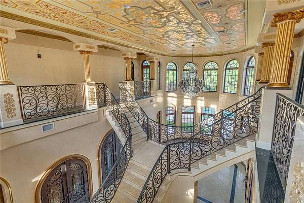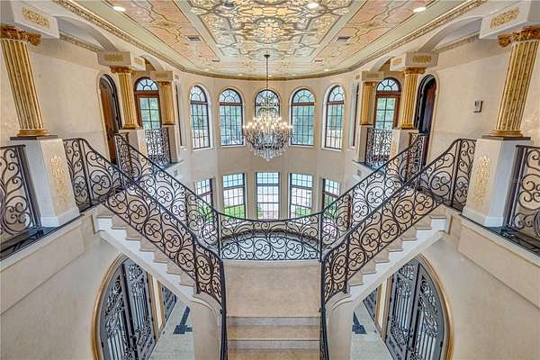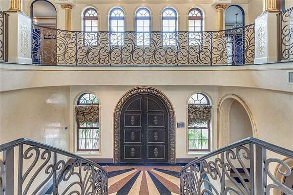 Nestled within the exclusive, double-gated enclave of Bellamere a 20 Acre 4 lot community, Villa Adriana stands as a testament to timeless Mediterranean-revival architecture and modern luxury. This extraordinary estate, spanning over 5 acres of impeccably manicured grounds, offers breathtaking, uninterrupted vistas of the tranquil Lake Kell. Crafted with a masterful touch, this 6-bedroom, 6.5-bathroom residence spans 6,820 square feet of exquisite living space. The home's interior is a curated collection of authentic, artisanal details, including Venetian plaster walls, Baroque-style painted and gold leaf ceilings, and a dramatic travertine staircase with a custom iron rail. The ambiance is elevated by 10 Swarovski crystal chandeliers, bespoke cherry cabinetry, and polished aged granite flooring that flows throughout the home.