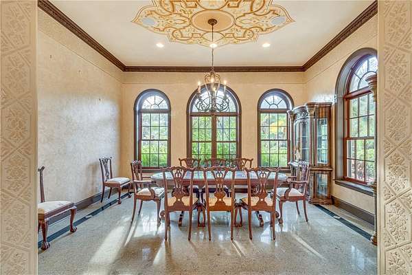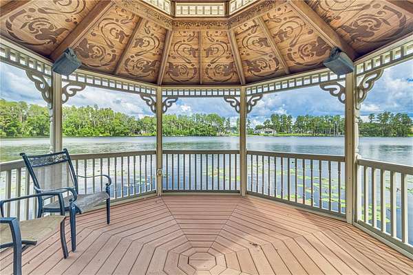 The exterior is an entertainer's paradise. A lavish saltwater pool with an integrated spa, sundeck, and cabana creates a resort-like atmosphere. The lush Tuscan-themed landscaping enhances the property's "Old World" charm, while a screened gazebo on the dock, over the water, provides a serene retreat for enjoying the lake views. Four garage spaces and a workshop area offer ample room for a collection of vehicles and hobbies.