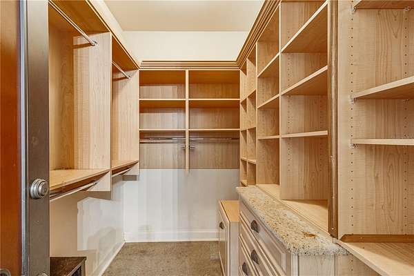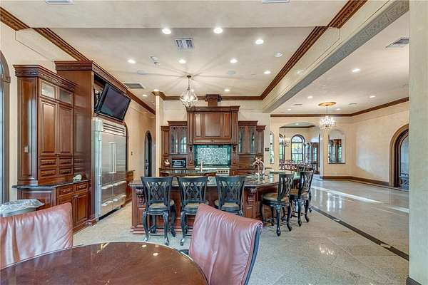 - Built-In Features, Cathedral Ceiling(s), Ceiling Fans(s), Coffered Ceiling(s), Crown Molding, Dry Bar, Eat-In Kitchen, High Ceilings, Kitchen/Family Room Combo, L Dining, Open Floorplan, Primary Bedroom Main Floor, Solid Wood Cabinets, Split Bedroom, Stone Counters, Thermostat, Tray Ceiling(s), Vaulted Ceiling(s), Walk-In Closet(s), Wet Bar, Window Treatments