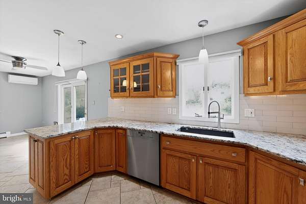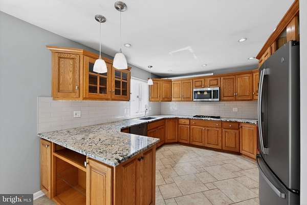 Custom contemporary Cape Cod set on a private, lushly landscaped 2-acre lot with tiered gardens and year-round plantings. This beautifully maintained home offers a spacious family room featuring hardwood floors, vaulted ceiling, and a stunning floor-to-ceiling stone wood-burning fireplace, with sliders leading to a wraparound deck. A unique two-tier loft provides flexible space for a home office, studio, or craft area. The kitchen is well-appointed with granite countertops, tile flooring, stainless steel appliances, gas cooktop, and double wall oven, and opens to a generous dining area with sliders to the rear deck complete with built-in flower boxes, canopy, and stone wall. A large laundry room doubles as a butler's pantry with abundant storage. Just off the kitchen, a step-down den is filled with natural light, showcasing a vaulted ceiling and charming knotty pine accent wall. The main level includes a primary bedroom with hardwood floors and en-suite bath, a second bedroom, and a full hall bath. The finished lower level offers excellent in-law or multi-generational living potential, featuring a spacious living area with wood stove, kitchenette, full bath, two additional rooms (ideal for bedrooms or offices), and private access through the garage. Outdoors, enjoy expansive landscaping with mature trees, shrubs, and vibrant plantings, a flagstone walkway, wraparound deck with tapered stairs overlooking terraced gardens, and a tranquil koi pond. Two large driveway areas provide ample parking. Backing to farmland with scenic views, this exceptional property combines privacy, functionality, and natural beauty.