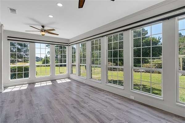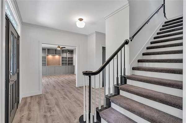 The home's inviting facade features Hardie plank siding, a welcoming front porch, and an elegant rotunda entry. Inside, you'll find luxury vinyl plank flooring, custom built-ins, and a warm sunroom with wall-to-wall windows overlooking the lush backyard.