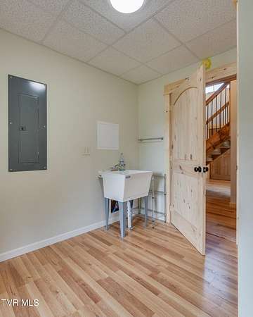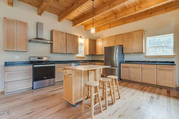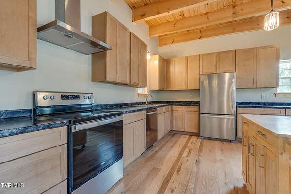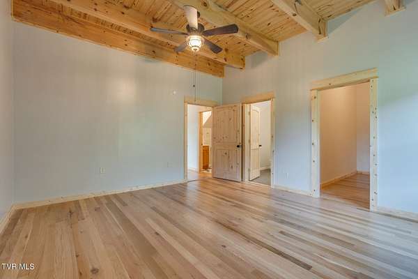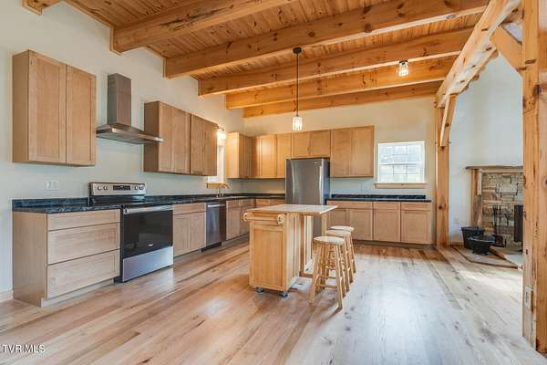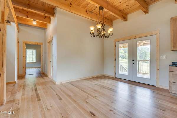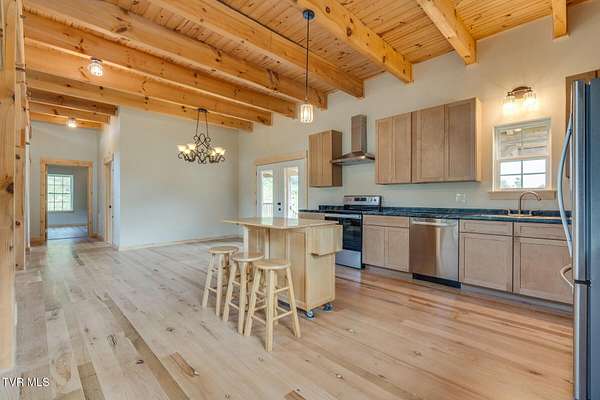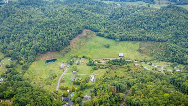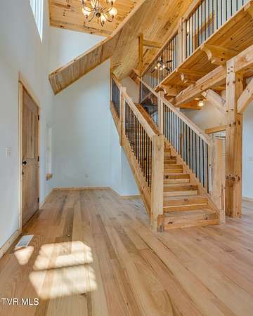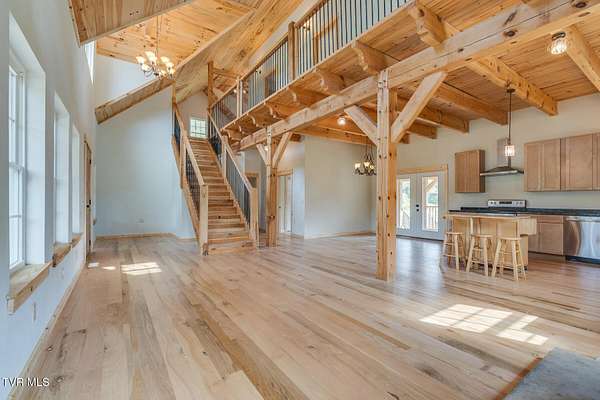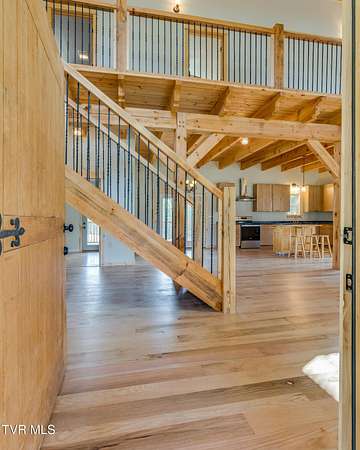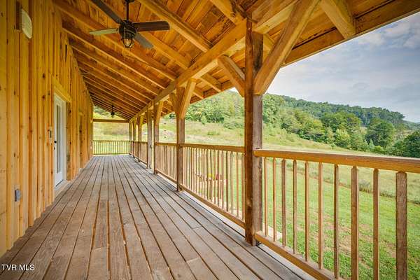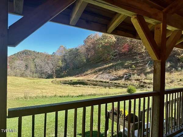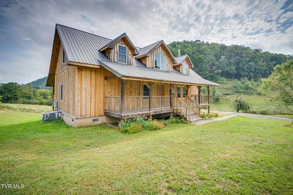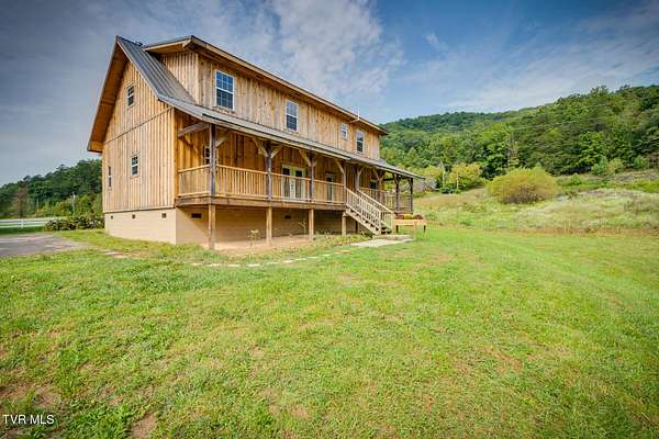 Custom Timber Frame home located on 8.14 acres in a serene valley surrounded by enchantingly beautiful East Tennessee mountains. Construction began in 2022 and was completed in September 2024. Walking through the front door you will be greeted by a grand staircase and open concept living, dining and kitchen areas with a vaulted ceiling of knotty pine and oak hardwood flooring that complements the elegant oak cabinetry in the kitchen. Natural quarried Crab Orchard Stone from Crossville, TN surrounds the fireplace and woodstove. A 16x16 primary bedroom with ensuite that boasts a floor to ceiling tiled, walk-in shower is located on the main level. There is a large walk-in closet located in the primary bedroom. You will also find a half bath and a laundry room with washer/dryer hookup and utility sink on the main floor. At the top of the staircase is a second spacious living area, a large closet and plenty of room for a home office. Two bedrooms and a full bath with a soaker tub overlook the first floor from the balcony. An Automatic switch has been installed and ready for a generator. Enjoy quiet mornings and cool fall evenings sitting on the covered back porch observing wildlife and admiring a view of the pond fully stocked with blue gill and large mouth bass. A spacious front porch also adorns this one of a kind home. There are mature pear trees, red raspberries and strawberries. High speed internet is available. (MLS# 9986783: 20.83 acres, with a 60X60 pole barn, adjoining the property that is available for purchase.) A recent survey is available upon request. This is an exceptionally beautiful property! All information is deemed reliable from Hawkins County Tax Documents and Owner. Buyer and Buyer's agent to perform due diligence.