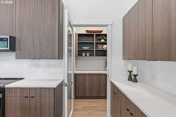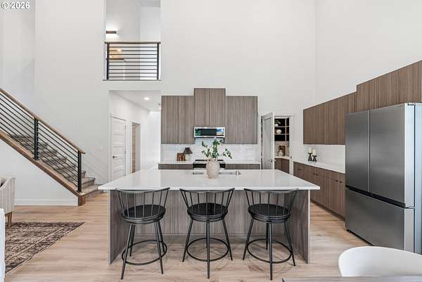 - Builtin Oven, Builtin Range, Butlers Pantry, Dishwasher, Free Standing Refrigerator, Island, Quartz, Stainless Steel Appliance, Tile
