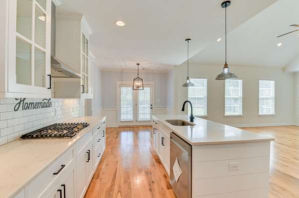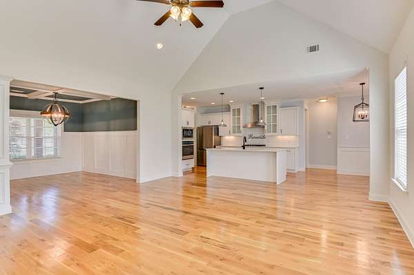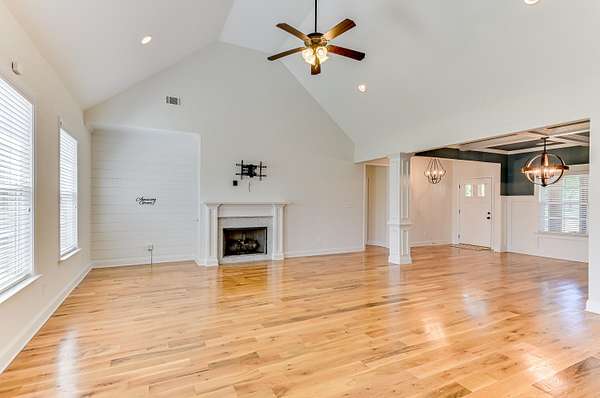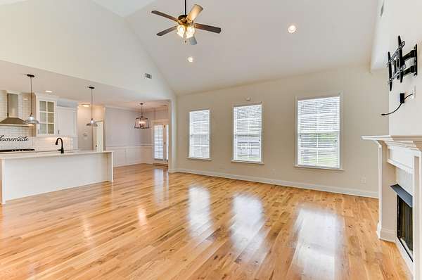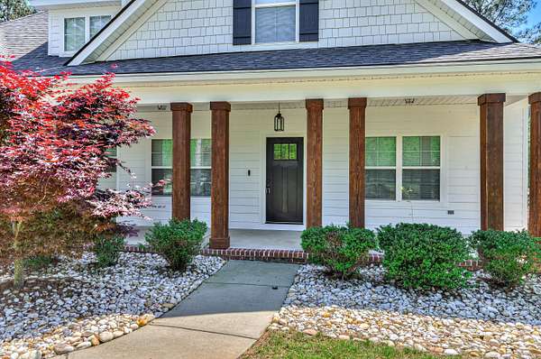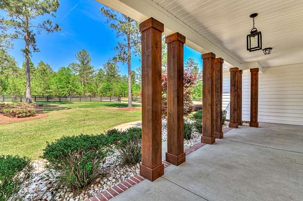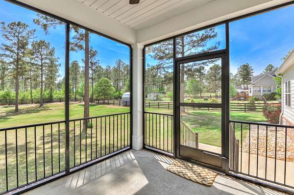 Simply breathtaking, this exceptional 4-bedroom, 3-bathroom Craftsman-style home is situated on a 1.5-acre lot that backs up to a 500-acre natural reserve. The open-concept floor plan is designed for comfortable living, featuring stunning hardwood floors and heavy trim throughout the main areas. Upon entry, a foyer leads to a formal dining room with a coffered ceiling and into the spectacular great room, boasting a vaulted ceiling, gas fireplace, and a wall of windows overlooking the backyard and nature preserve. The gourmet kitchen is a chef's delight, centered around a large island overlooking the great room. It features granite countertops, a large single basin sink, a tile backsplash, and all-new stainless steel appliances, including a drop-in gas range, wall oven/microwave combo, French-door refrigerator, and custom vent hood, along with a walk-in pantry and a sun-filled breakfast room with wainscoting and double French doors with built-in blinds. This split-bedroom plan offers three bedrooms and two full bathrooms on the main level, including the luxurious owner's suite. The owner's suite features a coffered ceiling, a spacious walk-in closet, and a spa-like bathroom with a soaking tub with tile surround, a separate tile shower, a solid-surface dual-sink vanity, and a private water closet. Upstairs, you will find the fourth bedroom suite, complete with a full bathroom and a spacious bonus room, plus a large walk-in attic for storage. Additional features include a walk-in laundry room with overhead cabinets and a utility sink with a granite countertop, a mudroom with a built-in bench, window blinds, a double side-entry garage featuring epoxy flooring and custom ceiling-mounted storage racks, a Culligan whole-house water filtration system, fresh exterior Emerald Rain Refresh paint with self-cleaning technology, and low-maintenance K-Guard gutters. The exterior is just as impressive as the interior, featuring a massive 34' x 8' (282 sq ft) covered front porch with stained columns. Out back, enjoy the peaceful surroundings from the 11' x 10' screened porch and an adjacent 12' x 13' rear patio. The 1.5-acre property is fully enclosed by a four-board ranch fence with no-climb wire. The backyard features a custom stone fire pit and walkway, perfect for evening stargazing. Landscaping includes a lawn irrigation system and a variety of established fruit trees and bushes, such as Meyer lemon, Kieffer pear, blueberry, Sunkist apricot, Lipan cherry, Black Arkansas apple, Yellow Delicious apple, peach, blackberry, and Black Bear fig. Goodsprings Estates is a gated community ideal for animal lovers, allowing horses, chickens, and goats. The neighborhood features a clubhouse and a 500-acre nature preserve, where deer, doves, cardinals, and other birds are frequently spotted. Enjoy peaceful country living just minutes from I-20 and conveniently close to shopping, dining, Aiken Regional Medical Centers, and more. All information, including measurements, is deemed reliable but not guaranteed and should be independently verified.