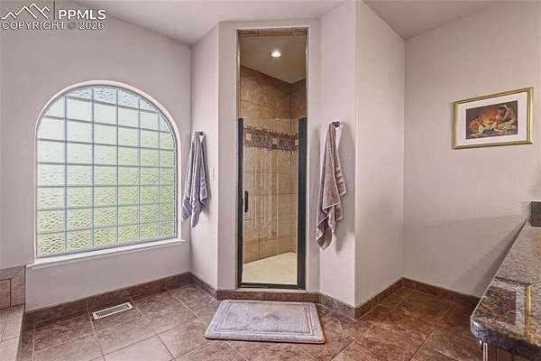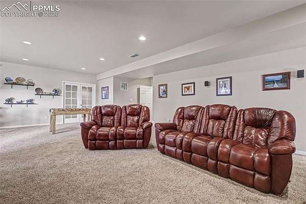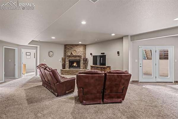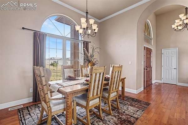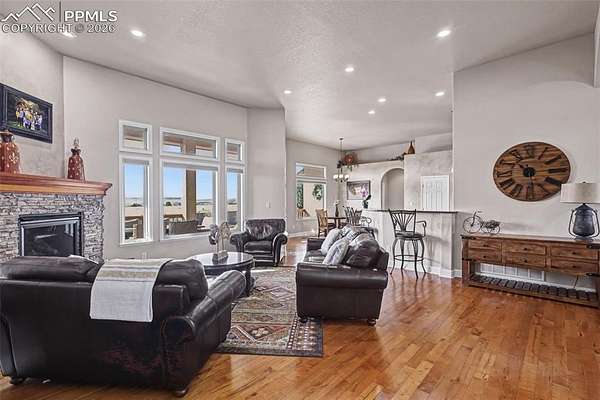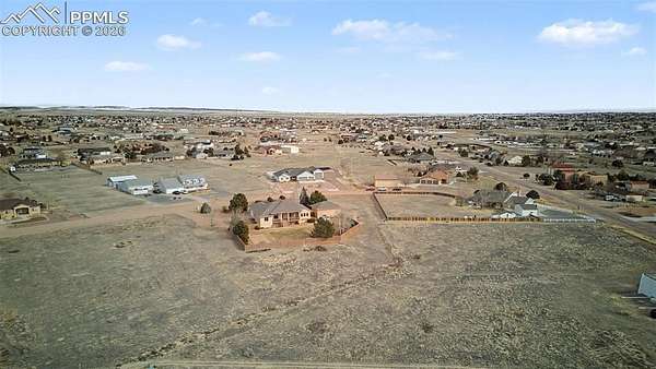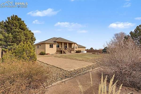 Set on 1.63 acres with sweeping mountain views and no neighbors behind, this custom-built ranch-style home offers exceptional space, privacy, and craftsmanship in a quiet Pueblo West neighborhood just ten minutes from the Pueblo Reservoir. Mature landscaping, inviting walkways, and a covered front porch create a welcoming first impression. With over 4,700 square feet and a walk-out basement, the layout is ideal for both everyday living and entertaining. The main level features 12-foot ceilings in the living room, dining room, kitchen, and dining area, complemented by hardwood floors, crown molding, and elegant archways. Large windows fill the open-concept living and kitchen spaces with natural light and showcase the mountain backdrop. The living room features a stacked-stone gas fireplace, while the kitchen offers granite countertops, stainless steel appliances, ample cabinetry, a pantry, generous prep space, and a hot water circulating pump. A formal dining area and additional eating nook provide flexibility for hosting. The primary suite is a private retreat with mountain views and a five-piece bath with jetted tub, walk-in shower, and granite countertops. Two additional bedrooms, a full bath, and main-level laundry complete the main floor. The walk-out basement features nine-foot ceilings, a spacious family room with stacked-stone fireplace and wet bar, a flexible bonus space, an additional bedroom, and a full bath-ideal for guests or multi-generational living. Outdoor amenities include a covered maintenance-free deck, lush grass, mature trees, a fire pit, volleyball area, and an above-ground heated pool. A four-car garage setup offers ample storage. With no HOA, peaceful surroundings, and incredible views, this property delivers space, privacy, and lifestyle.
