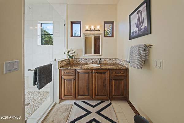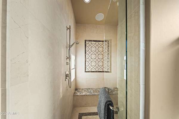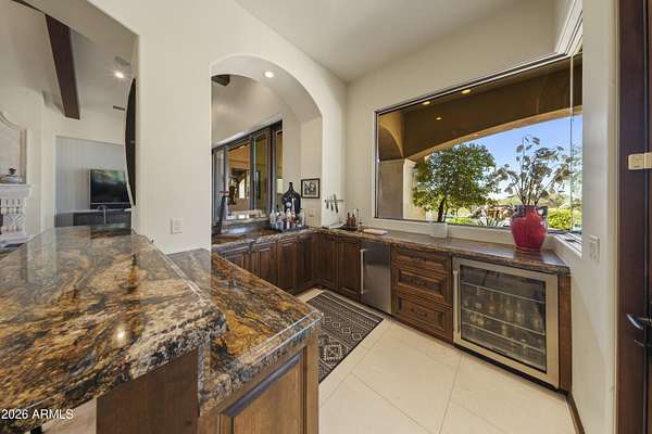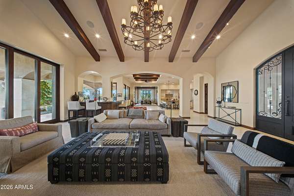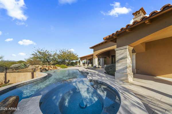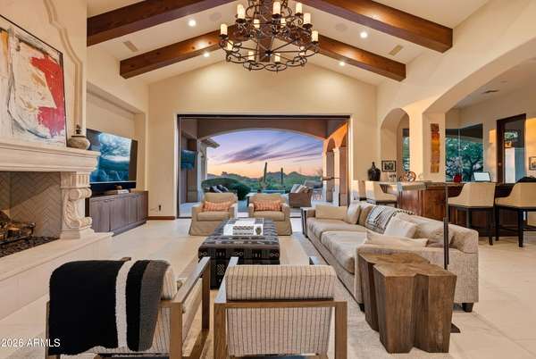 Your approach begins through a private gated courtyard where Pinnacle Peak commands the horizon. The grand entrance-marked by a bubbling water feature and French limestone appointments-leads to a custom 10-foot entry door that signals what lies beyond. Step inside to discover a great room defined by exposed timber architecture and refined contemporary finishes. But it's the view that captures you immediately. Floor-to-ceiling glass pocket doors dissolve the boundary between interior and exterior, framing Pinnacle Peak and Troon Mountain against a backdrop of mature desert landscaping that ensures complete privacy. The kitchen serves as the home's culinary centerpiece. Wolf appliances meet an oversized island designed for both the serious cook and the gracious host. A thoughtfully positioned wet bar connects kitchen, great room, and patio complete with dual wine refrigeration for your collection. The primary suite offers the space and privacy of a dedicated wing. Wake to mountain vistas. Breathe in the generous proportions. Two additional guest suites, each with en-suite baths and covered patios, provide your visitors with their own mountain views and private outdoor spaces. The detached casita elevates the guest experience further a complete residence unto itself with full living area, bedroom, bath, and patio. True separation. True hospitality. Set on 2.52 acres within the exclusive 12-home enclave of Collina E Vista, the location speaks for itself. Troon Country Club, Troon North, Estancia Country Club, Scottsdale National, and Desert Highlands are all within immediate reach. The three-car garage and private courtyard will satisfy the most discerning automotive enthusiast. Designed by Smith Design Associates and executed by Pat Brady Construction, this residence represents turn-key luxury at the highest level. This is move-in ready refinement in North Scottsdale's most coveted address.
