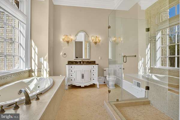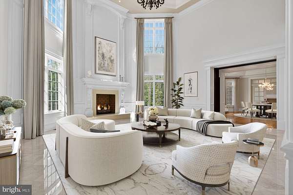 Set along a peaceful, tree-lined lane, 1174 Old Tolson Mill Road reveals a stunning, stone and brick gated estate, with award-winning landscaping by Charles Owen. This gorgeous home with over 15,000 square feet of living space designed by Arlene Christos reflects unmatched craftsmanship and elegant detailing. Offering both privacy and convenience, the property is ideally located just minutes from Great Falls National Park, Scott's Run Nature Preserve, and the world-class shopping and dining of Tysons Corner. There is a 2-story portico with columns, a custom wood-and-glass door adorned with wrought-iron inlays welcomes you to a two story marble foyer, featuring a grand split staircase beneath a soaring mezzanine inspired by New York's Four Seasons Hotel. The main level showcases elegant formal living and dining rooms, perfect for entertaining. The great room soars with a 24-foot ceiling and features a striking fireplace as its centerpiece. The gourmet kitchen is a chef's dream, complete with dual center islands, custom cabinetry, and top-of-the-line appliances, including an espresso machine, warming drawer, refrigerator drawer, and wine cooler. The adjacent family room offers a cozy fireplace, a Meridian surround sound system, and direct access to the terrace, seamlessly blending indoor and outdoor living. Also on the main level, a paneled library features custom built-in shelving and a charming bay window. The guest suite offers a walk-in closet and a spa-inspired bathroom, providing both comfort and elegance. The upper level is host to the primary suite that spans more than 38 feet and feels like a five-star retreat. Its double-tray ceiling, Phantom screened balcony, outdoor hot tub, and travertine-clad spa bath create a sanctuary of comfort and style. Three additional ensuite bedrooms, each with walk-in closets, plus a large laundry room with dual washer/dryer sets complete this level. The lower level is a recreation haven that includes a spacious recreation room with a masonry fireplace, a central wet bar framed by twin wine cellars, a game room, state-of-the-art home theater, and a spa with steam shower and sauna and a generous guest suite. The home is equipped with 18 interior and exterior cameras, hardwired doors and windows, and a 21-day recording system. Cell signal is enhanced on every level, with integrated smart home automation and a comprehensive security network. A Crestron smart system controls lighting and audio throughout the home.Security, and motorized shades in Owner's Suite are easily managed from your smartphone. Outside, the estate spans two private acres with fully fenced grounds, highlighted by expansive terraces and meandering pathways. Built for both convenience and performance, the home features a three-level private elevator, dual garage lifts for five vehicles, four HVAC systems, a central vacuum, and an 80kW Generac generator ensuring uninterrupted comfort. Pool & terrace are proposed renderings.