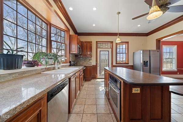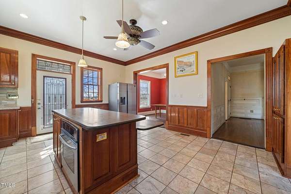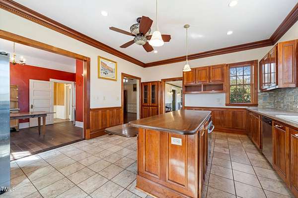 - Ceiling Fan(s), Chandelier, Crown Molding, Dining L, Eat-In Kitchen, Entrance Foyer, Granite Counters, High Ceilings, Kitchen Island, Natural Woodwork, Primary Downstairs, Second Primary Bedroom, Separate Shower, Stone Counters, Walk-In Closet(s)