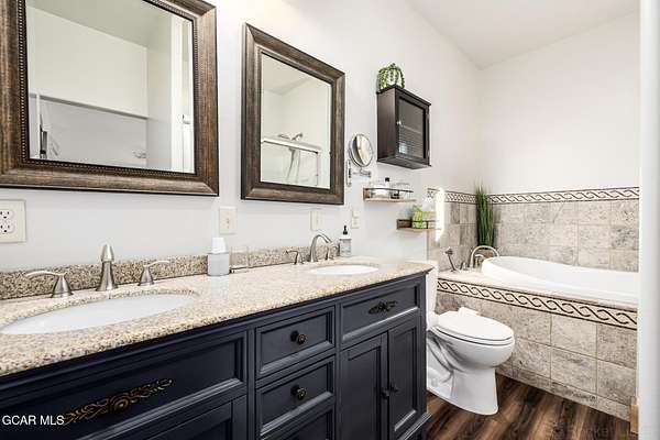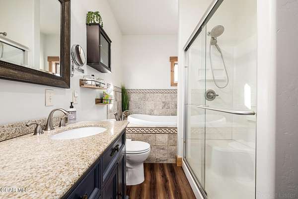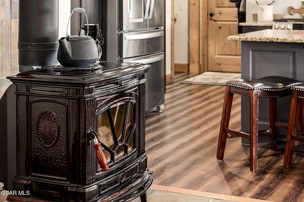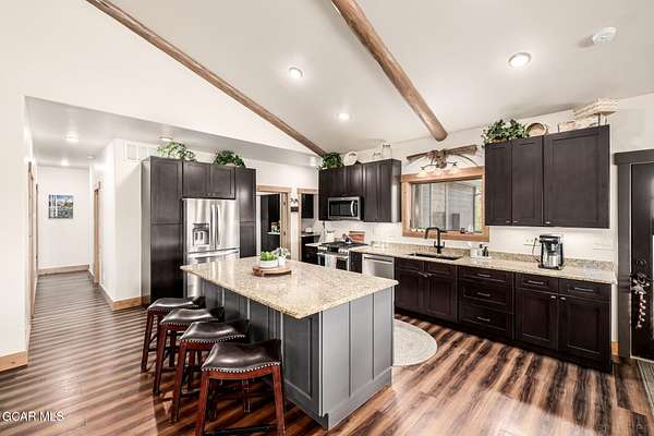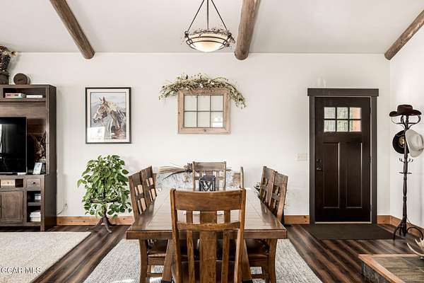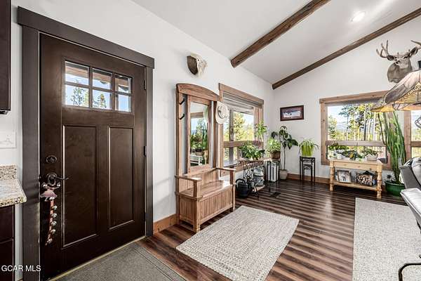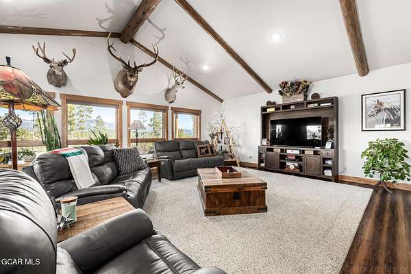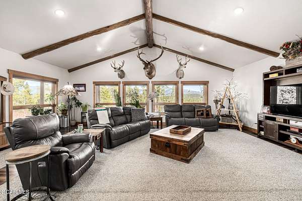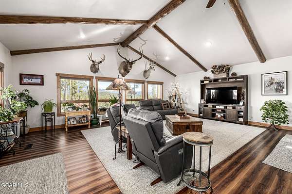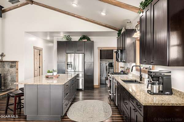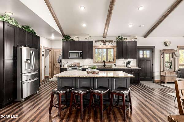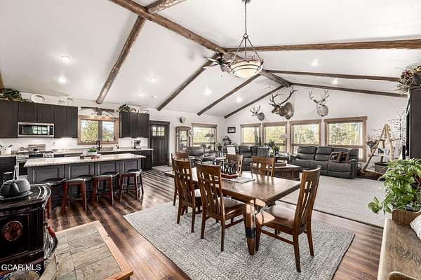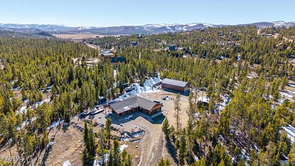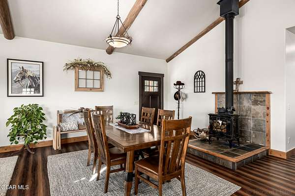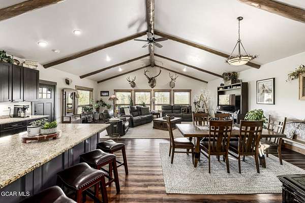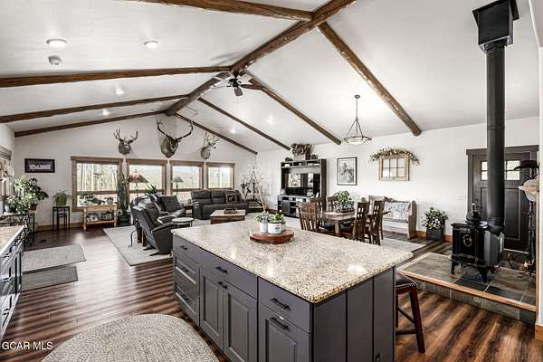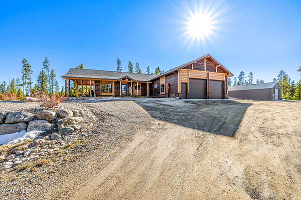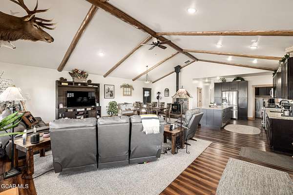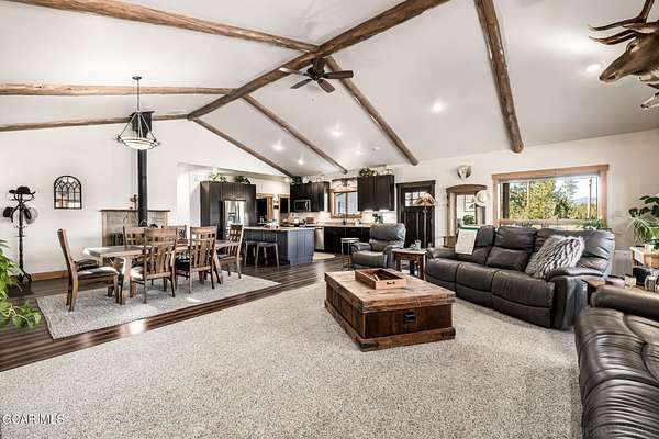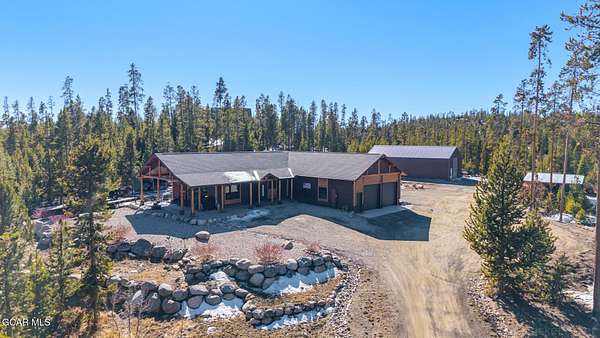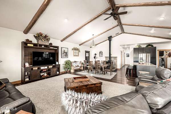Endless mountain views and wide-open space set the tone for this beautiful ranch-style retreat! This is the perfect ranch setting that is a ranch with a ease of being low maintenance. Situated on a sprawling 4.15-acre lot, the property is surrounded by many mature trees that enhance privacy while capturing breathtaking views from every angle. Offerin 3 , 2 bathrooms, and an attached 2-car garage. The inviting interior showcases abundant natural light, neutral paint, recessed lighting, wood-look flooring in common areas, and plush carpet in bedrooms. The open layout is both functional and welcoming, highlighted by a freestanding fireplace and a vaulted ceiling with exposed beams. The impeccable kitchen boasts SS appliances, granite counters, espresso shaker cabinetry, and an island with island with a breakfast bar. A dedicated office/ bedroom is perfect setting all on the main level. The primary bedroom has a walk-in closet and an ensuite with a dual granite vanity, a soaking tub, and a separate shower. A secondary bedroom and full bath provide additional space, while the laundry room includes built-in cabinetry for added convenience. You'll love the wrap-around covered patio, an ideal spot to relax and take in the peaceful surroundings and scenic views! PLUS!! Completing the property is a detached Barn, storage shed and an oversized workshop with room for an RV, offering versatility for storage, projects, or recreational use. A rare opportunity to enjoy space, privacy, and stunning natural beauty in one remarkable setting. Look no further! Home, sweet home! You will love the ample room of this low-key property on idyllic setting sitting.