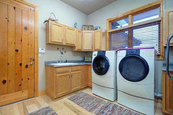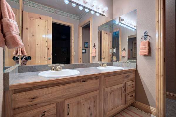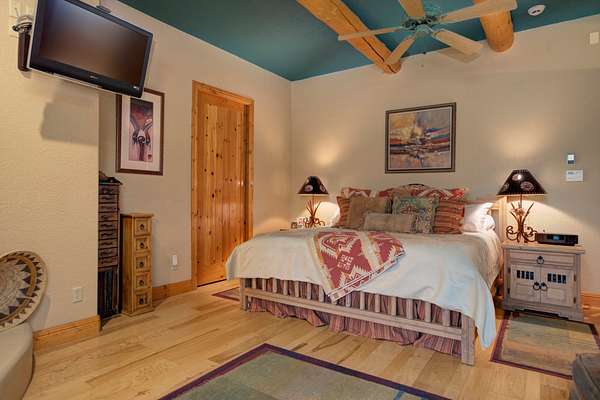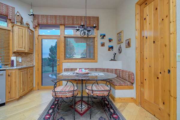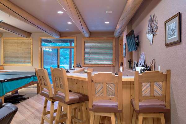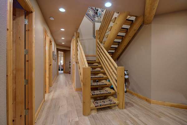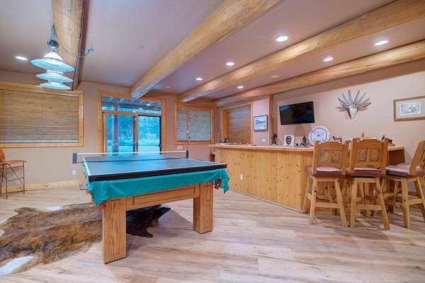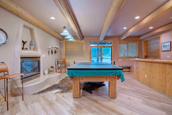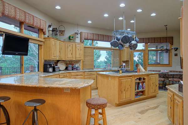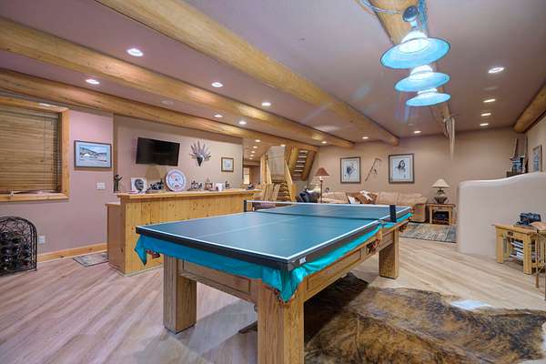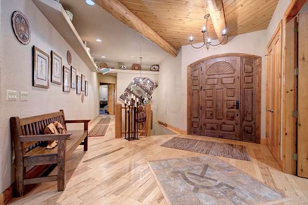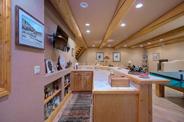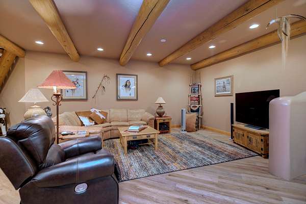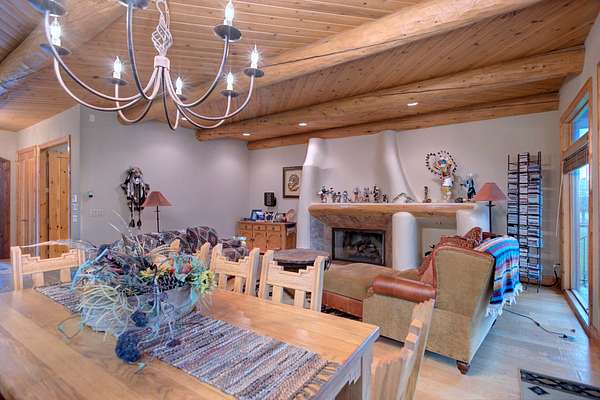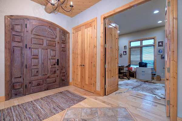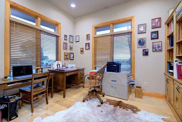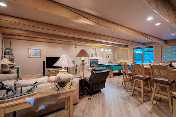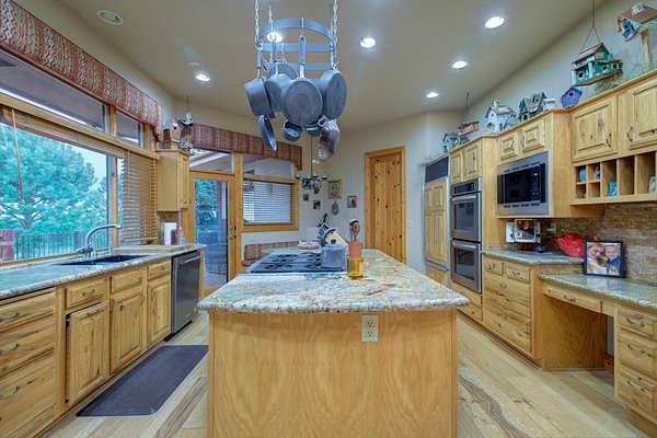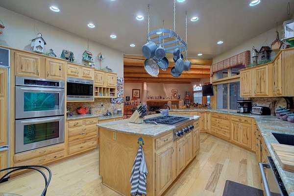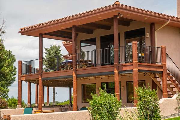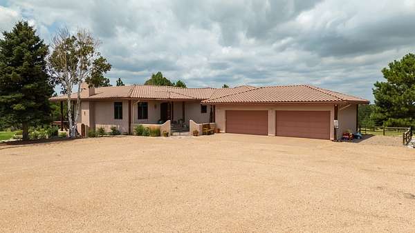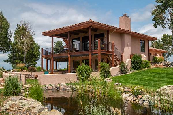 The main home is a fabulous custom built Santa Fe style stucco and log accent home overlooking the ranch, that boasts 4,480 finished square feet of living area. The home has four large bedrooms and four bathrooms. The main level features a large custom kitchen with a Subzero refrigerator, a Thermador 6 burner gas stove top and a double oven, granite counter tops, and a custom granite sink. The main floor living room features a custom Santa Fe style fireplace and walks out to an enormous western facing deck with log accents. The large master suite wing of the house has a Kiva style fireplace and an incredible custom 5 piece master bathroom and a spacious walk-in closet. The laundry is on the main level as well as the attached oversized 4 car garage. The fully finished basement features three large bedrooms and two full bathrooms, a family entertainment room with a wet bar. The basement family room walk out onto a large patio and wonderfully landscaped yard. The home boasts numerous custom touches, such as custom Santa Fe interior and exterior doors, custom handmade granite sinks created by Richard Pankrazt Pottery, log accents and custom flooring. The manicured yard includes over a quarter acre of underground automatic sprinklers, extensive landscaping, and a Koi Pond with fish. The home is heated with in-floor radiant heat.