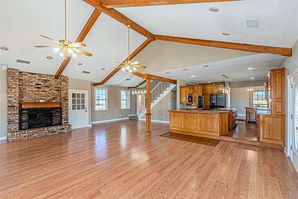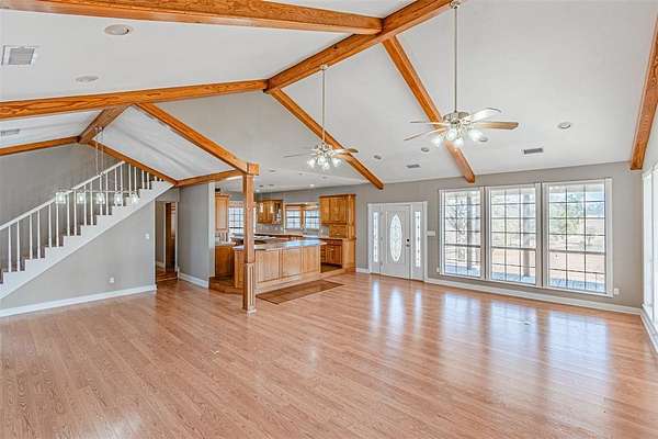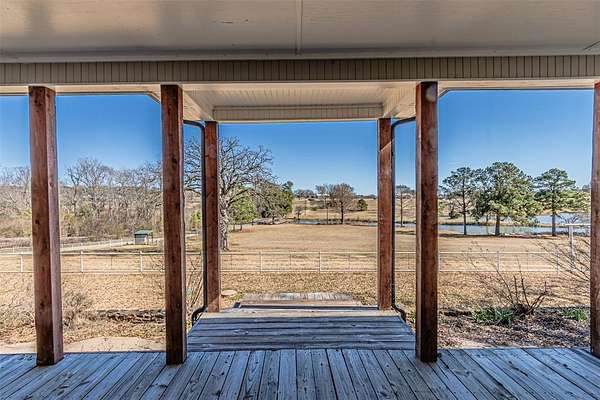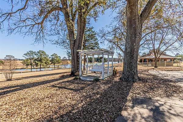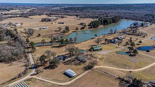 Tucked inside the gated Caddo Creek Estates community, this inviting lakeside retreat offers the kind of setting that makes you slow down and stay awhile. Set on approximately 1.8 acres with sweeping views of Caddo Creek Lake, this modern farmhouse with thoughtful updates blends classic character with peaceful surroundings. A wraparound porch welcomes you in and quickly becomes your favorite spot for morning coffee or evening sunsets. Inside, vaulted ceilings, abundant natural light, and three wood-burning fireplaces add warmth throughout the living spaces. The kitchen is designed for everyday living and entertaining, featuring an island, breakfast bar, pantry, and ample cabinetry flowing into the main areas. The primary suite offers dual sinks, separate vanities, soaking tub, walk-in shower, and generous closet space. Two additional bedrooms are complemented by bonus rooms ideal for office, game room, or guests. Outdoors, mature trees and open green space lead toward the lake. A spacious barn with a large indoor chicken coop adds flexibility for hobby farming or storage. The best of both worlds: part of the property is within the HOA, providing access to clubhouse, pool, stocked lake and fishing docks. Additionally there are a couple stocked ponds, while a portion of the land remains unrestricted and could be used for a shop, boat storage, or guest house. With a private well, electric gate entry, oversized garage, and peaceful lake views, this property delivers space, character, and a setting that's increasingly hard to find. Come experience relaxed country living with the comfort of a welcoming community, bring your vision and make it your own.