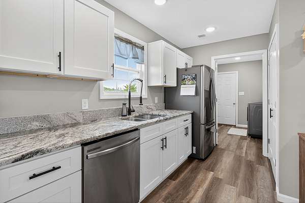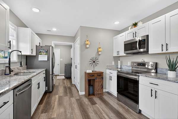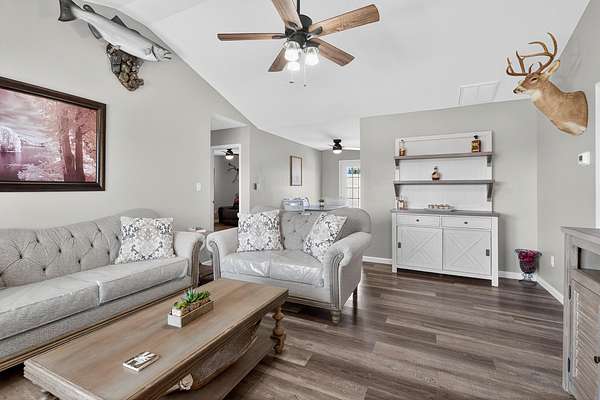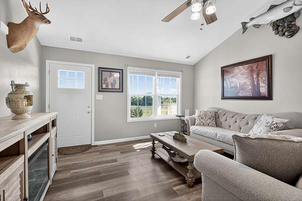Welcome to this beautiful ranch home set on 1.54 acres, offering the perfect blend of comfort, style, and functionality. A concrete driveway leads you to an inviting front entrance. Inside, the spacious layout features a split-bedroom design, with the private primary suite tucked away on one side of the home. The suite boasts a luxurious full bathroom with his-and-her walk-in closets, a custom-tiled shower, and double vanities. On the opposite side, you'll find three additional bedrooms and a full bathroom, providing plenty of space for family or guests. The large living room is filled with natural light and enhanced by vaulted ceilings. The kitchen has granite countertops, stainless steel appliances, and crisp white shaker cabinets. Outdoor and hobby enthusiasts will appreciate the single-car attached garage, a covered RV carport, and a detached 28x24 garage-perfect for additional vehicles, workshop space, or storage. With its generous lot, modern finishes, and thoughtful design, this property is ready to welcome you home. Back on market, no fault to seller or property.