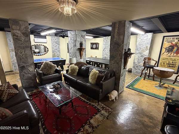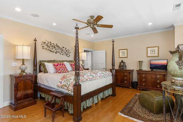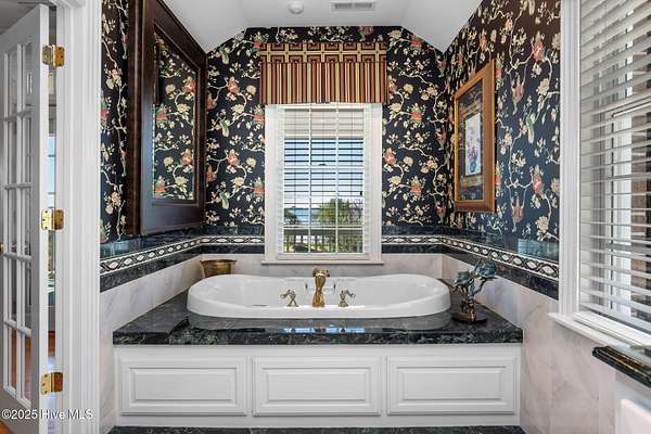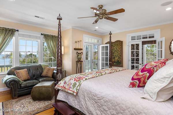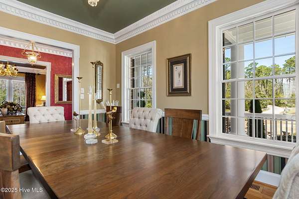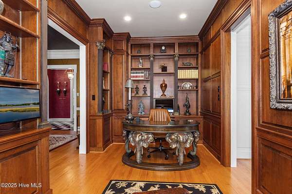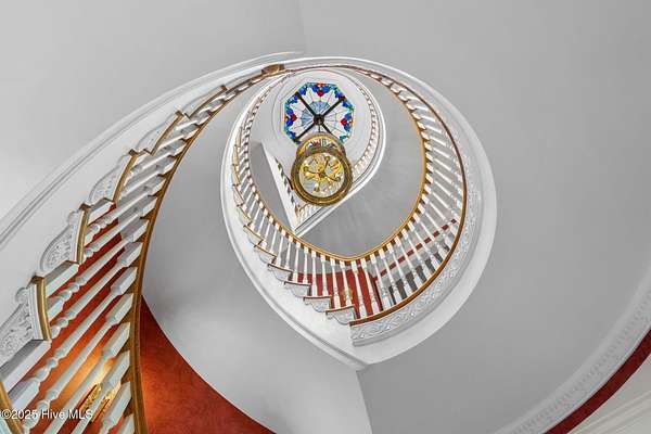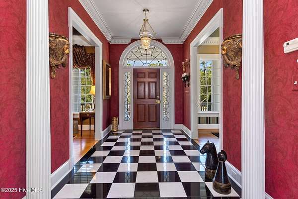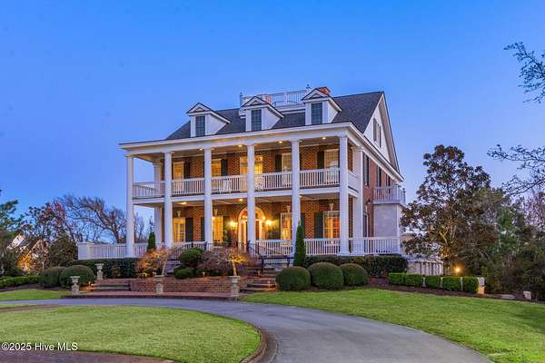 The grandeur of this 6400sqft estate cannot be captured in words or pictures, but we will try. As you first approach this 5 + acre estate, you are swept away by the lush walkways, fountains, statues, stone fireplaces, and hidden gardens. The two-story columns and wrap-around porches immediately let you step back in time to the true Southern Estate. Enter the front foyer and step onto the black and white Italian marble floor as you lose yourself in the view of the three-story circular staircase, crowned with a skylight and a magnificent chandelier. Every room boasts 10-foot ceilings to accommodate majestic chandeliers and intricate crown molding. The formal living room and dining room are tastefully majestic, while the kitchen and family room are warm and inviting. The study has floor-to-ceiling bookshelves and wood paneling, which is absolutely spectacular. As you ascend the circular staircase, one bedroom is more beautiful than the next, each with a private bathroom. Your accent will culminate with access to the rooftop widows' watch. Gazing down into the massive waterfront backyard yard you can enjoy views of the pool, hot tub, boat launch, and yes, private hog slat dock with not just one but two boat lifts. Finish out your tour with a visit to the two-car detached ''barn'' with a 1-br apartment above, and you simply will not want to ever leave this small slice of Southern Splendor found here in Eastern NC.
