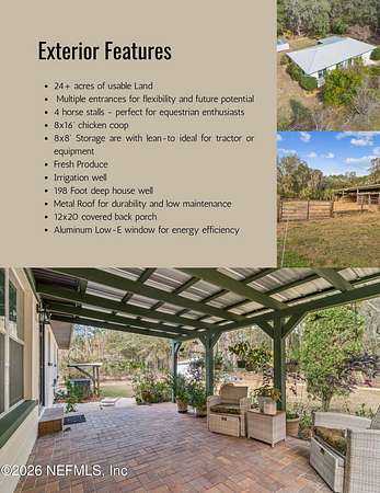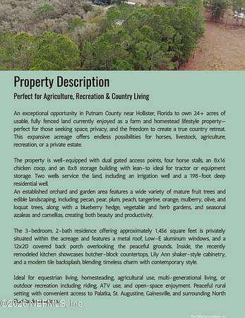 An exceptional opportunity in Putnam County near Hollister to own 24+ acres of usable, fully fenced land currently enjoyed as a farm and homestead lifestyle property-ideal for those seeking space, privacy, and the freedom to create a true country retreat. The 3-bedroom, 2-bath residence offers approximately 1,456 square feet and is privately situated within the acreage, featuring a metal roof, Low-E aluminum windows, and a 12x20 covered back porch overlooking the peaceful grounds. Inside, the recently remodeled kitchen showcases butcher-block countertops, Lily Ann shaker-style cabinetry, and a modern tile backsplash, blending timeless charm with contemporary style. The property is well-equipped with dual gated access points, four horse stalls, an 8x16 chicken coop, and an 8x8 storage building with lean-to-ideal for tractor or equipment storage. Two wells service the property, including an irrigation well and a 198-foot deep residential well. Perfect for equestrian living, homesteading, agricultural use, or outdoor recreation such as riding and ATV use, this expansive acreage offers endless possibilities for horses, livestock, gardening, or a private estate. Peacefully located with convenient access to Palatka, St. Augustine, Gainesville, and surrounding North Florida destinations.