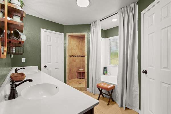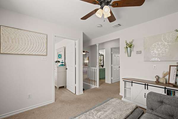 - Breakfast Bar, Ceiling Fan(s), Chandelier, Double Vanity, Entrance Foyer, Interior Steps, Multiple Living Areas, Pantry, Primary Bedroom On Main, Quartz Counters, Soaking Tub, Study/Home Office, Walk-In Closet(s)