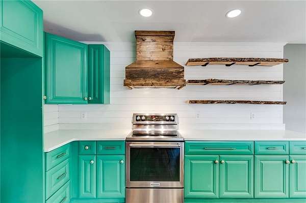 The standout kitchen is thoughtfully designed with bold green shaker cabinets, quartz countertops, stainless steel appliances, a farmhouse sink, custom wood vent hood, open shelving, and an oversized island with bar seating and extra storage.