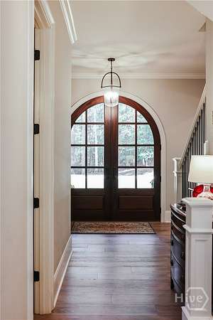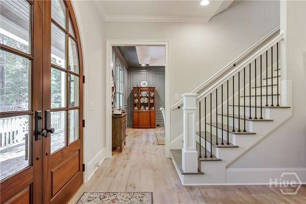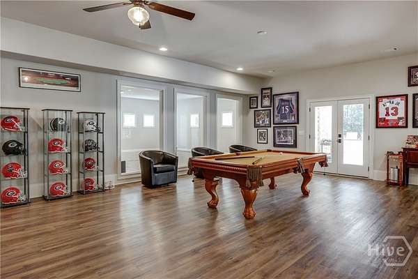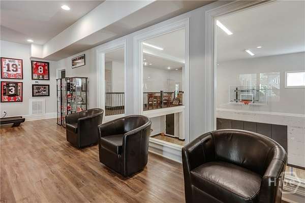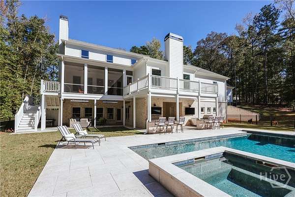 Set on nearly eight private acres in Oconee County with a coveted Athens address, this magnificent Georgian-inspired estate seamlessly blends timeless architecture with luxury living at every turn. From the sweeping front porch framed by mature trees to the resort-style pool and spa overlooking manicured grounds, every detail of this 8,872 sq ft home has been curated for both grand entertaining and everyday comfort. The main level features a formal dining room, a chef's kitchen with quartzite countertops, custom cabinetry, a wine tower, pecky cypress beams, and a hidden walk-in pantry - all flowing into the living area and screened porch. The primary suite and a guest suite are also on the main level. Upstairs offers a media room, two bedrooms with a Jack-and-Jill bath, and a third guest suite. The terrace level provides a full living area, bedroom, bath, and direct pool access - ideal for guests or multigenerational living. An indoor basketball court and three-car garage complete this one-of-a-kind property. A rare opportunity to own a private estate just minutes from the heart of Athens.