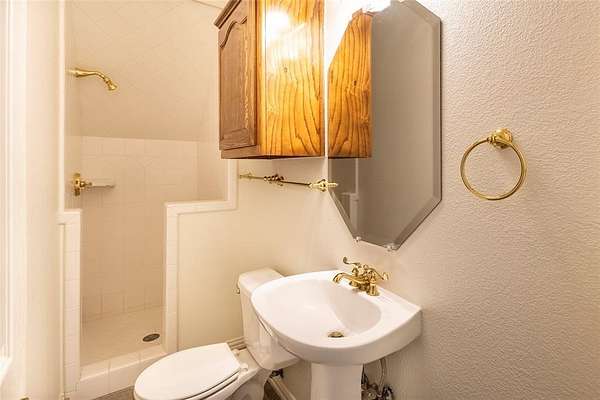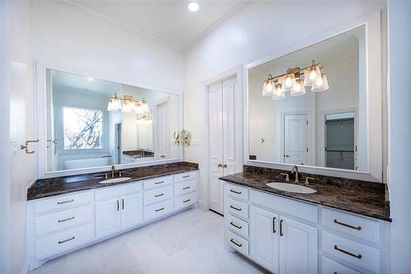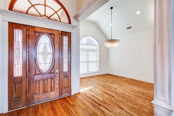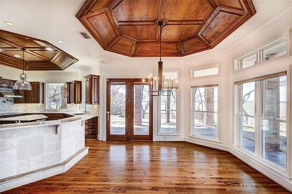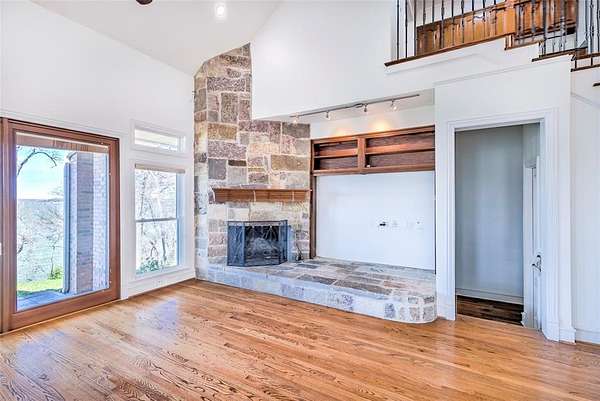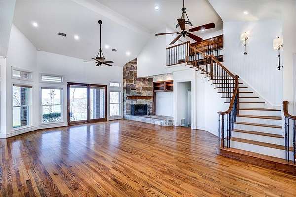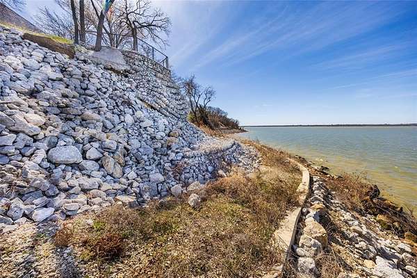 Welcome to this stunning Lake Lewisville lakefront estate with sweeping water views. The recently updated main home features new flooring, fixtures, and renovated kitchen and baths. The grand living area showcases a dramatic staircase, stone fireplace, and expansive lake views. A stately study offers hardwood floors, built-ins, rounded windows, and a hidden storm shelter. The gourmet kitchen features hardwood ceiling accents, ample storage, an island with prep sink, industrial built-in refrigerator, and Viking hood. The breakfast nook and patio provide beautiful lake views. The oversized primary suite includes bay windows overlooking the water, sitting area space, and a spa-like bath with dual vanities, garden tub, separate shower, and two walk-in closets. Upstairs includes a game room with bay windows and wet bar, plus additional bedrooms with Jack-and-Jill bath. A separate apartment above the garage includes a kitchen, living area, bedroom, and full bath. Enjoy outdoor living with multi-level patios, stone pathways to the water, and wooded privacy. Additional features include oversized garage, geothermal HVAC, 3 water heaters, 5 heat pumps, and propane generator.