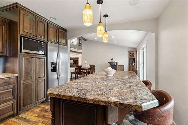 The heart of the home is the stunning kitchen, complete with custom cabinetry and a large island, making it perfect for cooking and entertaining. The open floor plan connects the kitchen, dining, and living areas, creating a welcoming and functional space for family gatherings.