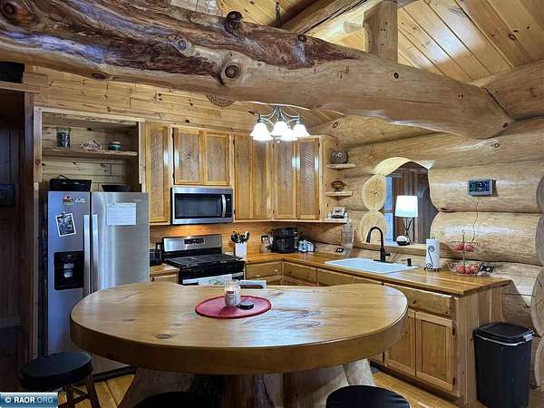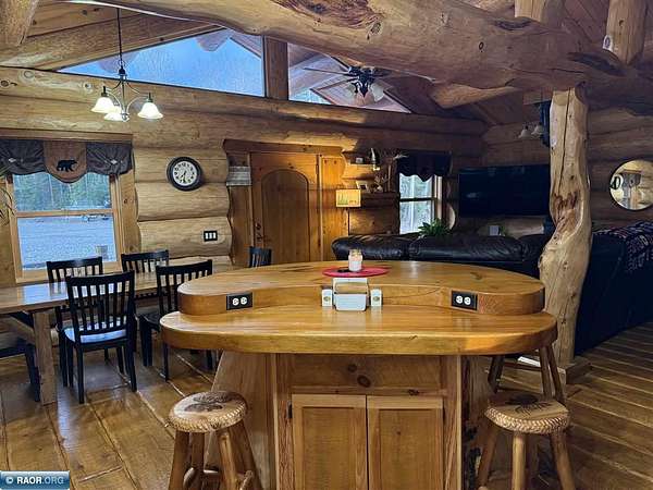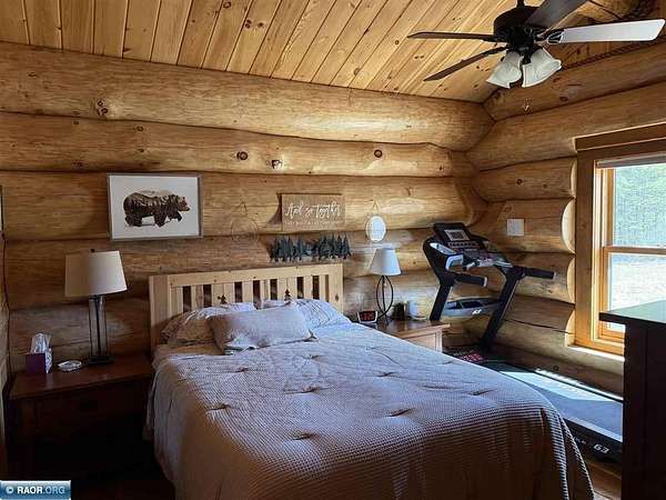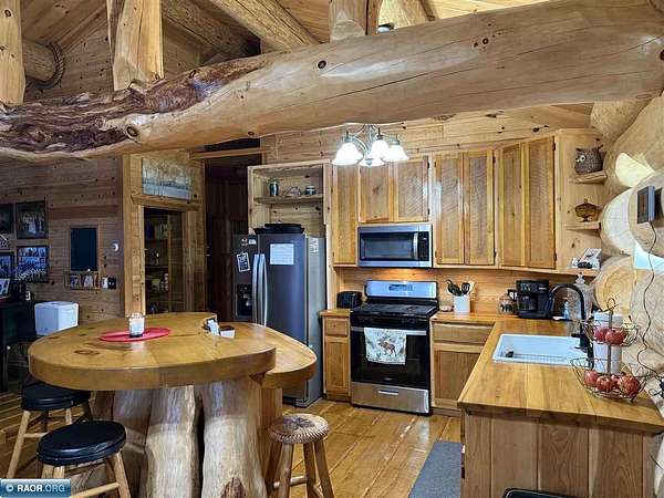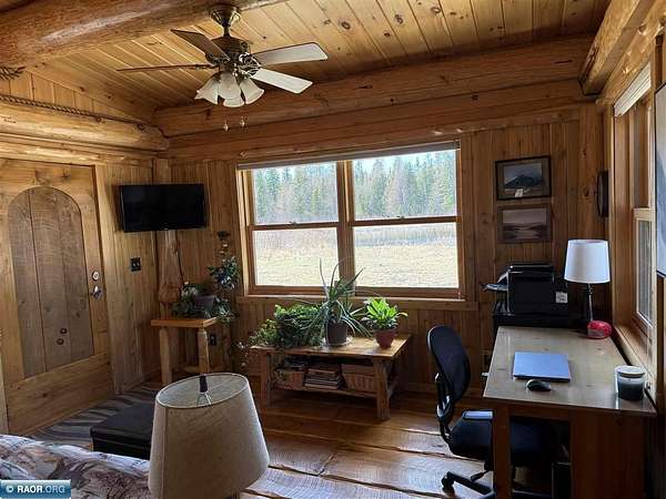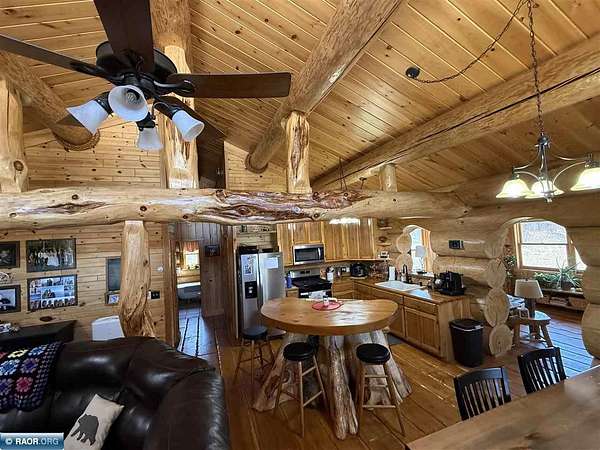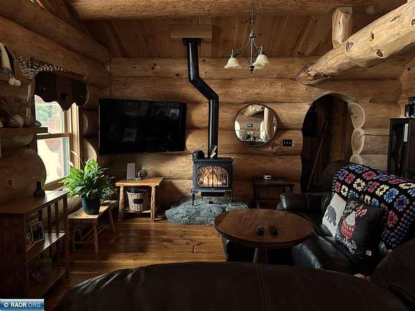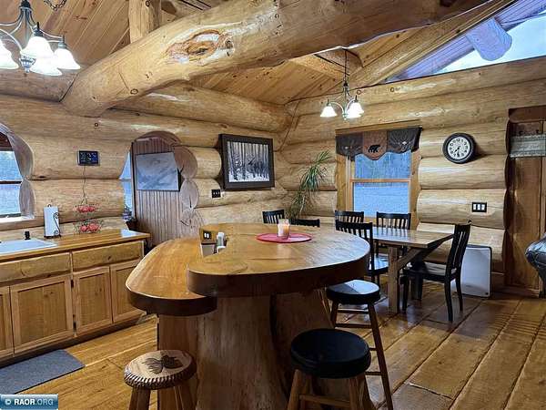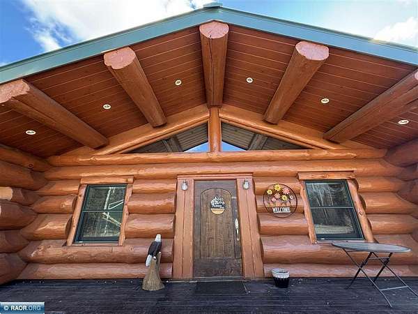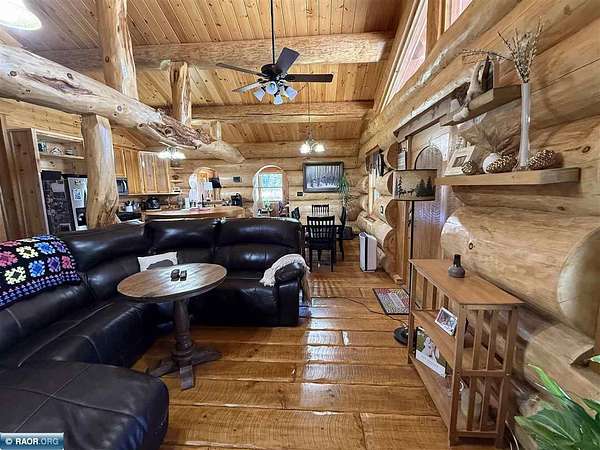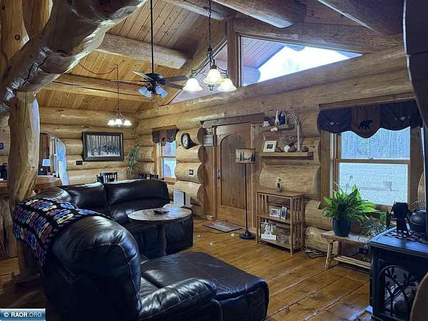 If you are looking for peace and quiet year around or perhaps a summer getaway, come take a look at this beautiful one-of-a-kind custom built log home on 40 acres with a wildlife pond right out the sunroom windows. The craftsmanship of this unique home will leave you in awe. From the large, scribed logs and vaulted ceilings to the tongue and groove walls, wood doors and unique wood flooring, you will see just how special this place is. The open floor plan features a living room, kitchen and dining area featuring a tree trunk island. 2 bedrooms and one bathroom situated at the back of the home. The large entry with a second bathroom and laundry/utility room. A loft for storage or extra sleeping space. Also, can’t forget the sunroom on the west side of the home overlooking the pond, wood line and sunsets. The large front deck is covered and the back deck off the sunroom leads to the firepit. This is one level living at its finest.
