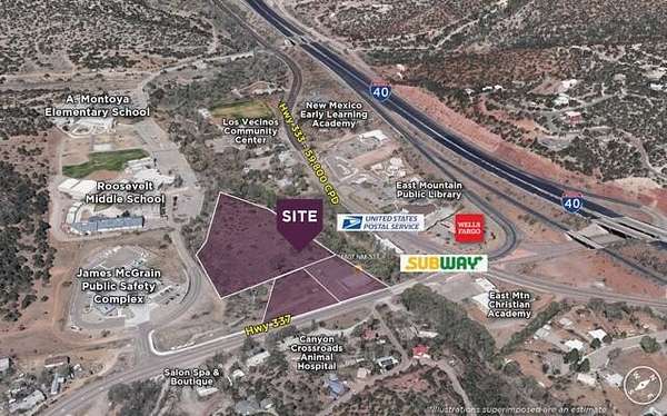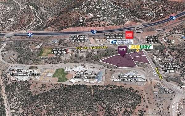 Driving East on Interstate i40, Get off on Tijeras Exit, Pass NM Hwy 333 Light, Property is on the North Side frontage on NM-Hwy 337.