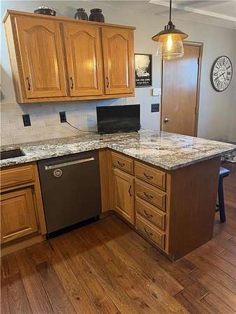 Spacious ranch house with great curb appeal and a large family room featuring high ceilings and big windows. The main floor has a sizable laundry room near the kitchen. The finished basement provides a fourth nonconforming bedroom, with a full bath and wet bar. The all-electric home has a 24x23 garage, stubbed for a bathroom. Enjoy the outdoor kitchen. The subdivision's streets are privately maintained through HOA fees, covering upkeep and snow removal. Room sizes are approximate. Highlights include hardwood floors, granite kitchen countertops, a new front door, stone veneer facade, updated roof, and concrete driveway. The property includes a 24x40 heated workshop, a 12x16 shed with electricity, a six-foot privacy fence, a hot tub, and a concrete patio. Recent updates feature a new heat pump, central air, water heater, and new wet bar down stairs.