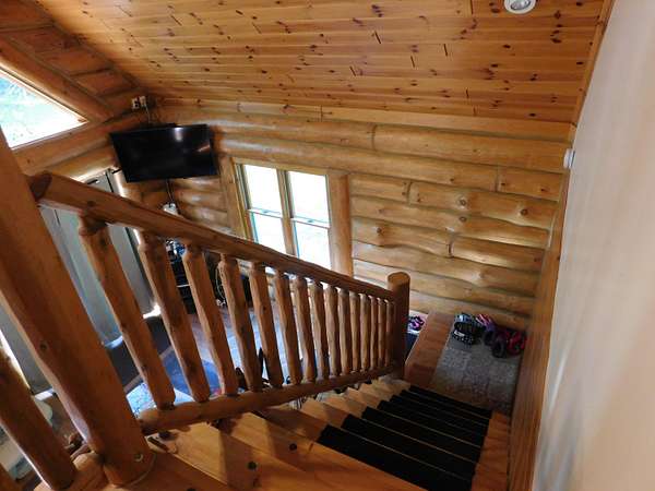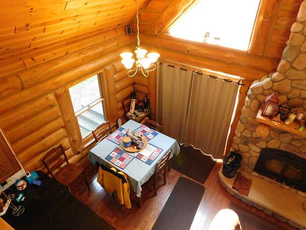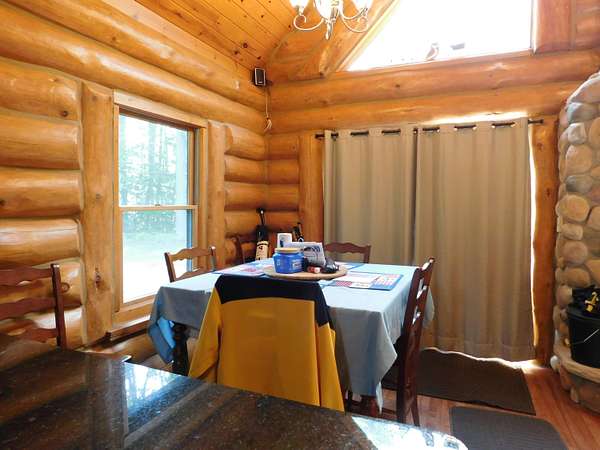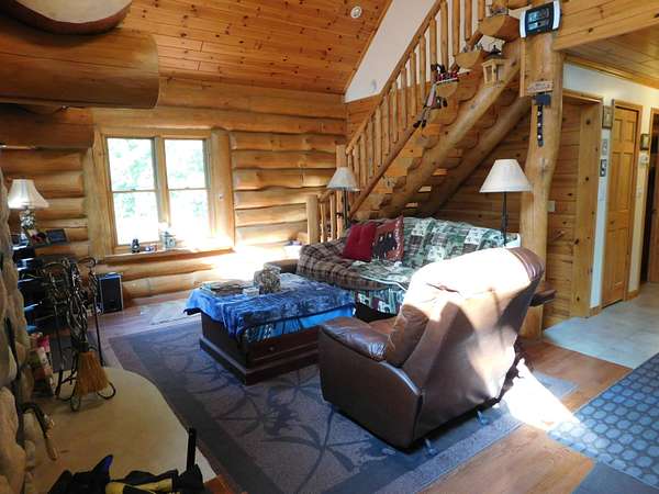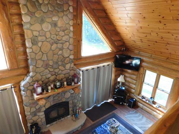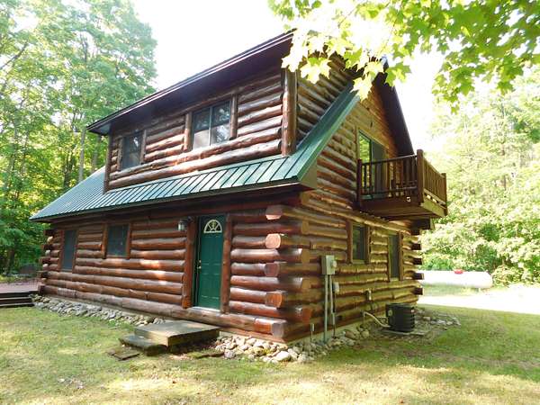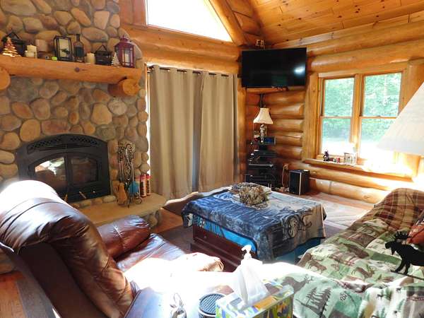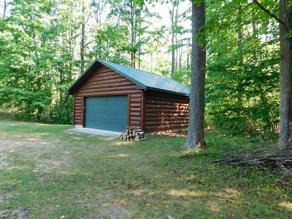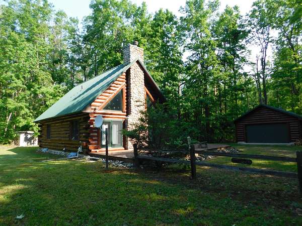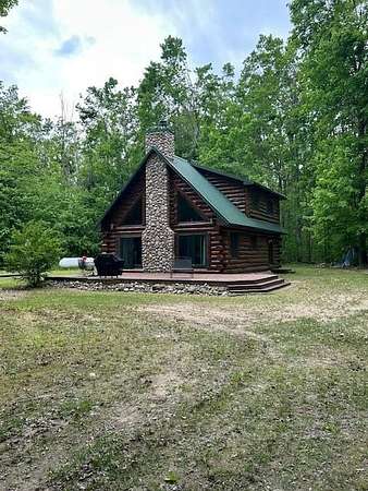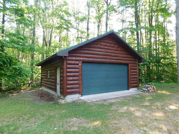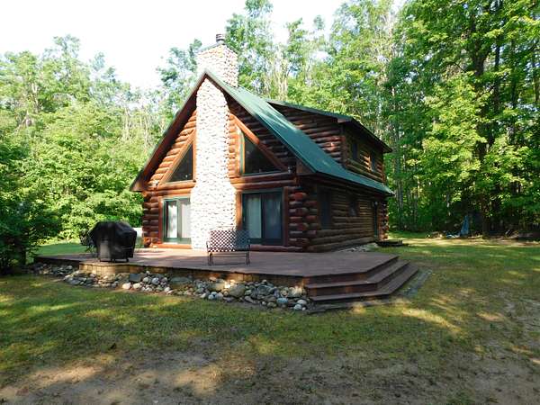 Beautiful log home is what you'll find on the stunning 5 acre parcel. Home feature floor to ceiling stone fireplace, two bedroom, two full baths, a full basement with poured walls and a large 2 car detached garage. Master suite has slider door to upper deck to enjoy nature. Central air helps on those hot summer nights and huge deck is great for family gatherings. A perfect up north get away or could possibly be your dream home. Tons of wildlife has been seen on this property.