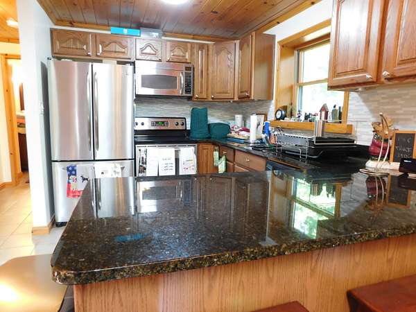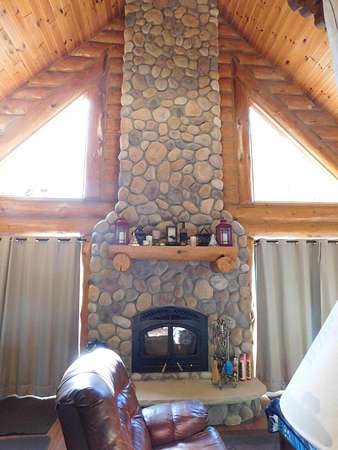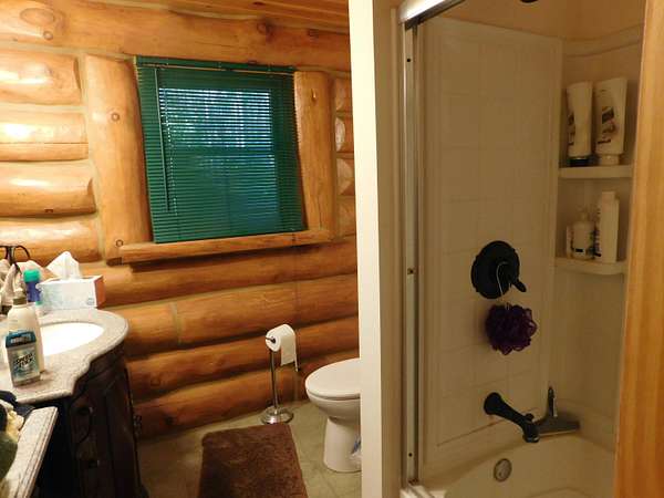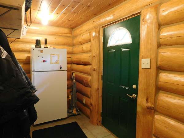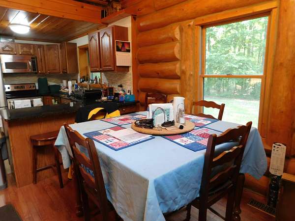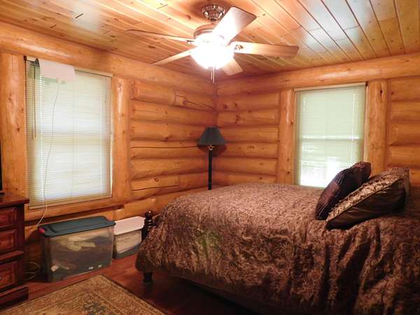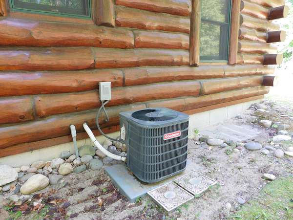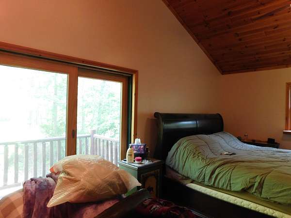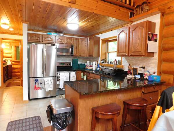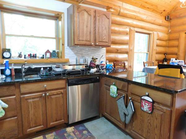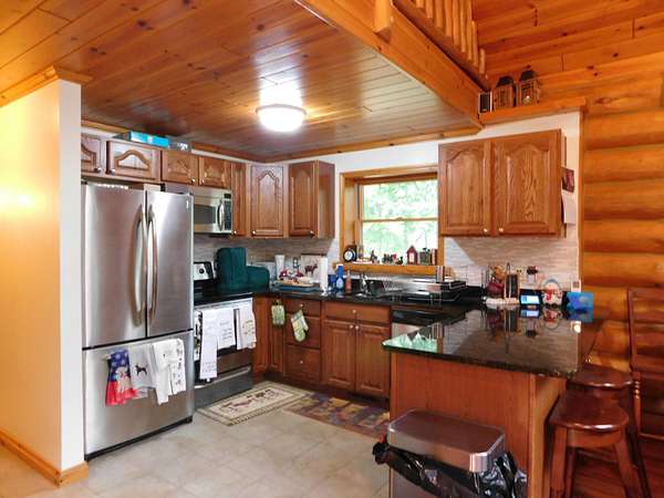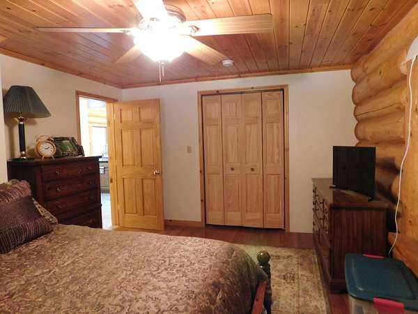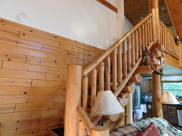 Beautiful log home is what you'll find on the stunning 5 acre parcel. Home feature floor to ceiling stone fireplace, two bedroom, two full baths, a full basement with poured walls and a large 2 car detached garage. Master suite has slider door to upper deck to enjoy nature. Central air helps on those hot summer nights and huge deck is great for family gatherings. A perfect up north get away or could possibly be your dream home. Tons of wildlife has been seen on this property.