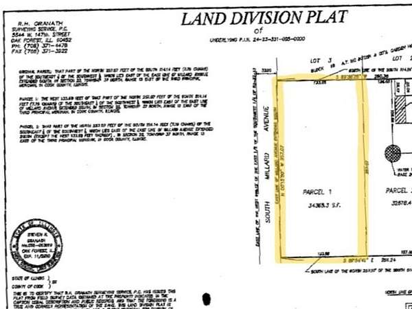 A prime development opportunity is available at 11809 S Millard Ave., in unincorporated Garden Homes/Alsip, IL. This wooded parcel measures approximately 257.07 feet of frontage by 133.68 feet in depth, totaling nearly 0.98 acres. The property is equipped with water and sewer to site and is situated on a dead-end street lined with single-family homes, offering a tranquil setting with convenient access to shopping, dining, and major interstates. This lot presents the potential to subdivide and construct two or more homes, making it an attractive option for builders and developers. ZONING DISTRICT: R-5 Single Family Residence District. DRIVE-BY TO VIEW LOT & BRING YOUR OFFERS IN!