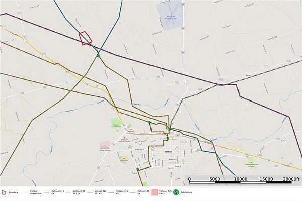 This 88.88 +OR- acres is located northwest of Vernon, TX on County Rd 97 N, in Wilbarger County, TX. It is currently under a 1-D-1 Agriculture tax use for low taxes (only $11.55 in 2025!). It currently has two large transmission lines crossing it, the largest being an Oncor Energy line that runs to the Oklaunion Power Plant, approximately 16 miles down line. The 2nd line ties into a smaller substation just 0.6 miles south of the property, which is owned by WFEC (Western Farmer Electric Cooperative).