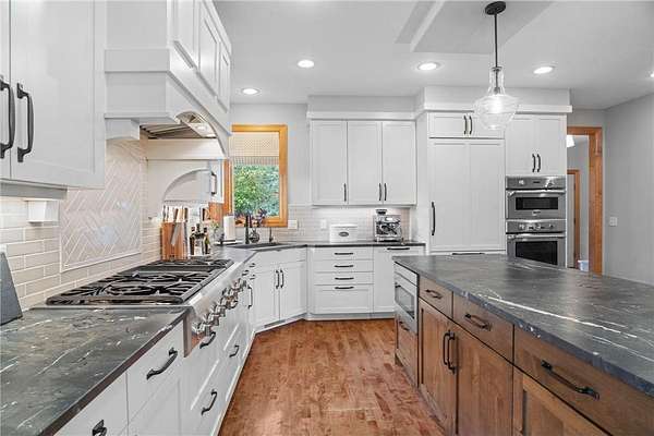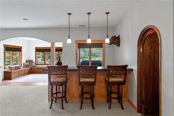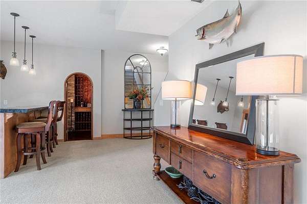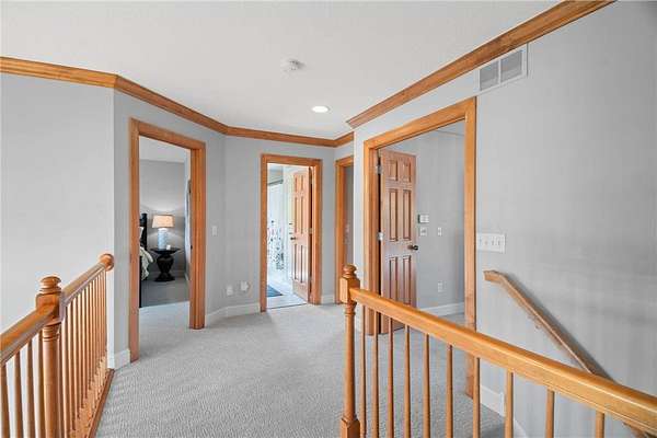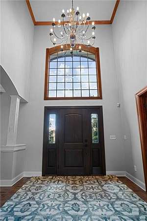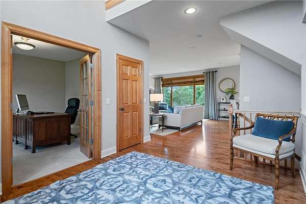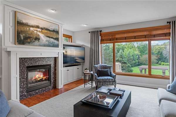 Nestled on 1.5 acres in the prestigious Eagles Watch neighborhood, this executive model home blends impeccable craftsmanship with serene luxury, offering an unparalleled living experience. From the moment you arrive, the property welcomes you with a sense of elegance and tranquility, set against the backdrop of lush landscaping, wooded views and scenic walking trails. As you enter through the front doors, you're greeted by a grand two-story foyer bathed in natural light, creating a sense of openness and grandeur. Soaring ceilings and custom millwork provide a refined introduction to this thoughtfully designed home. The open-concept layout flows effortlessly from room to room, inviting both relaxed living and sophisticated entertaining. Maple hardwood floors and custom built-in cabinetry add warmth and character, while large windows frame picturesque views of the surrounding nature. At the heart of the home, the gourmet kitchen is a true masterpiece. A spacious center island anchors the space, while sleek stainless steel appliances and floor-to-ceiling custom cabinetry elevate both style and function. Whether you're preparing a casual family meal or hosting a grand dinner party, this kitchen provides the perfect setting. Just off the kitchen, the formal dining room offers an intimate space for elegant gatherings. The sunroom, with its inviting ambiance, is the perfect place to relax and enjoy the beauty of the outdoors, flowing seamlessly onto a large deck designed for entertaining. Below, a beautifully designed paver patio awaits, featuring a striking stone fireplace and a charming pergola. This outdoor living space creates an idyllic family oasis, ideal for evening gatherings under the stars. Lush landscaping, highlighted by a boulder wall, lovely flower beds and apple trees, adds to the serene atmosphere, while mature pines provide natural privacy, making the outdoor spaces feel like a secluded retreat. Throughout the home, every detail has been carefully considered to create an environment that is both luxurious and comfortable. Custom millwork, detailed moldings, and high-end finishes enhance the home's timeless character. For those who need a quiet space to work, the private home office offers a peaceful retreat. Upstairs, the home offers four generously sized bedrooms, including the tranquil owner's suite, where every detail has been curated for relaxation. The spa-like ensuite features a jetted tub, a walk-in shower, dual vanities, and expansive his-and-her walk-in closets. A cozy sunroom completes the owner's suite, offering a quiet space to unwind after a long day, surrounded by calming views of the surrounding landscape. The walk-out fully finished lower level is designed with entertainment in mind. Featuring a custom bar, wine room, large family room, and versatile space perfect for a gym or flex room, this lower level offers endless possibilities for leisure and enjoyment. The three-car garage offers generous space for vehicles, outdoor gear, and more. Impeccably maintained and thoughtfully designed, this home is the perfect blend of luxury and everyday comfort. Situated in one of the most picturesque and desirable neighborhoods, this extraordinary property is a sanctuary, providing a lifestyle that is both peaceful and connected, elegant and inviting. Schedule your private showing today!