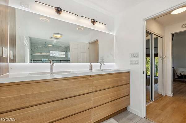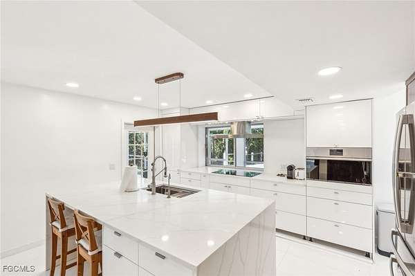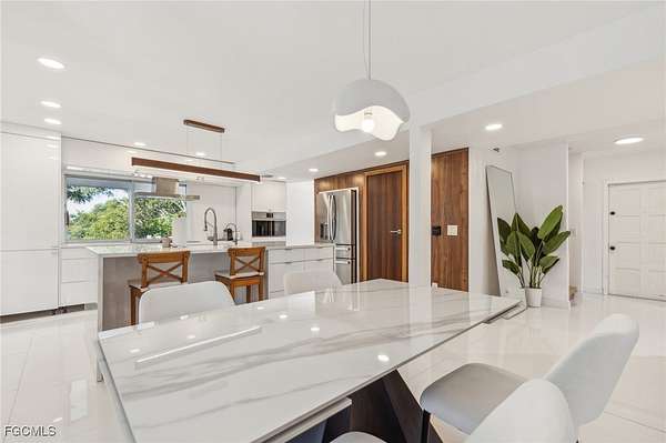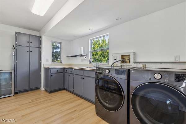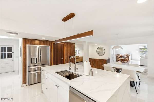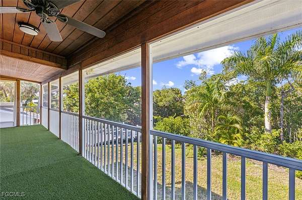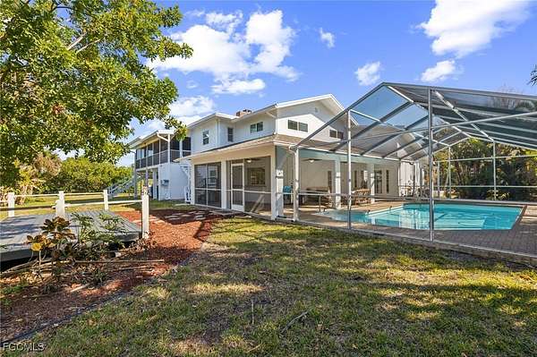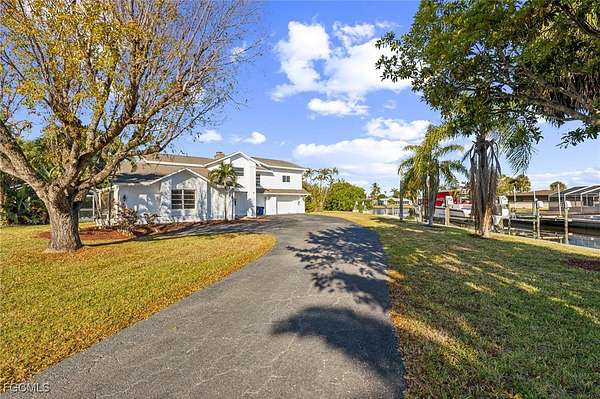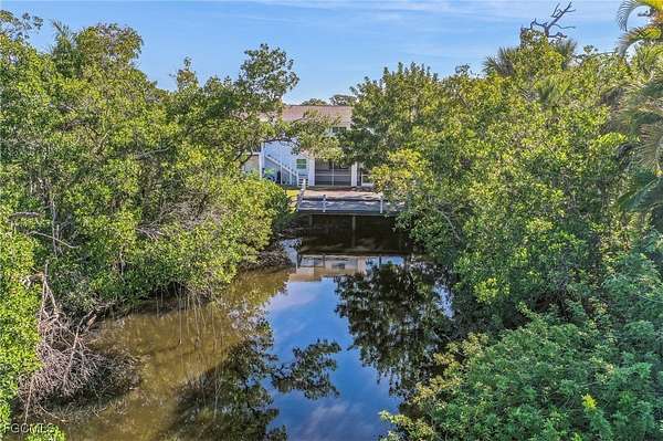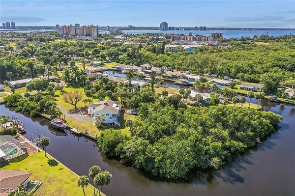 Welcome to your own slice of paradise! This exquisite waterfront estate sits on nearly 2 acres of lush tropical vegetation, creating an ambiance of exclusivity, elegance and privacy that feels like your own private island. At 3,048 sqft under air, this one-of-a-kind property offers breathtaking water views that can be felt from every room. Situated just minutes from the Caloosahatchee River and Downtown Fort Myers, this property presents a rare opportunity to live on expansive gulf-access acreage in a prime, centrally located part of town. The interior has been beautifully updated with luxurious modern finishes throughout. The fully renovated kitchen features custom Italian cabinetry, high-end Cafe appliances and quartz countertops with an accompanying island. This space is highlighted by the majestic views of your own private mangrove forest, canal and oversized dock that can be seen through the pass through window centered in the kitchen - a perfect atmosphere while cooking and entertaining guests. The adjacent living room is very spacious, offering an impressive projection screen and entertainment center to enjoy. A full bath is located downstairs for added convenience. French doors from both the kitchen and living room lead to an enclosed lanai and heated pool. As you enter the second level, you are greeted by a large sitting area with fireplace, which comfortably separates the master suite from its 3 generously sized guest bedrooms. An exterior deck spans out from here to the master bedroom, accessible by sets of sliders found in both rooms or by the exterior stairs. The master features vaulted ceilings, a huge walk-in closet and a spa-like bath with dual sinks, a new vanity and walk-in shower. Other notable features include a new 20,000 lb boat lift with 50 amp service, a 24'x30' oversized 2-car garage with workshop and Tesla charging station. This is the definition of a boaters paradise and Florida living at its finest! Don't let this one escape you!
