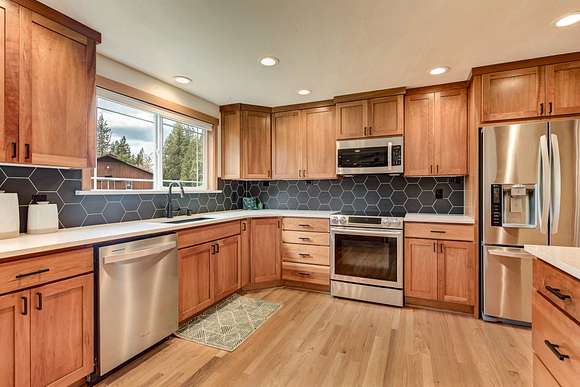 - Kitchen boasts new quartz countertops and tile backsplash, installed in 2023, complemented by cherry cabinets and all stainless steel appliances