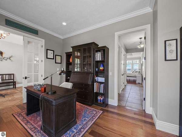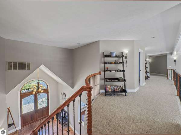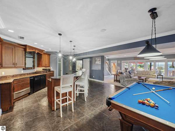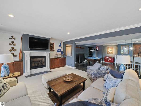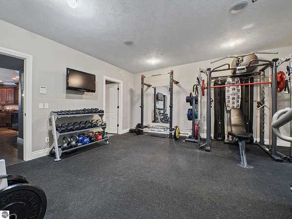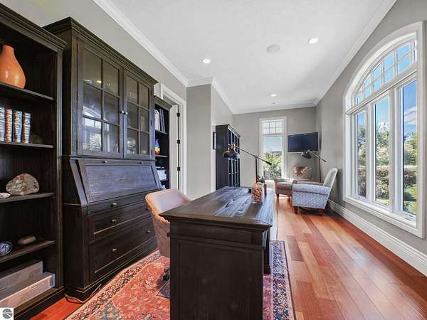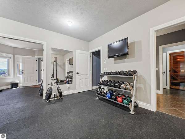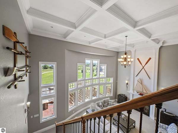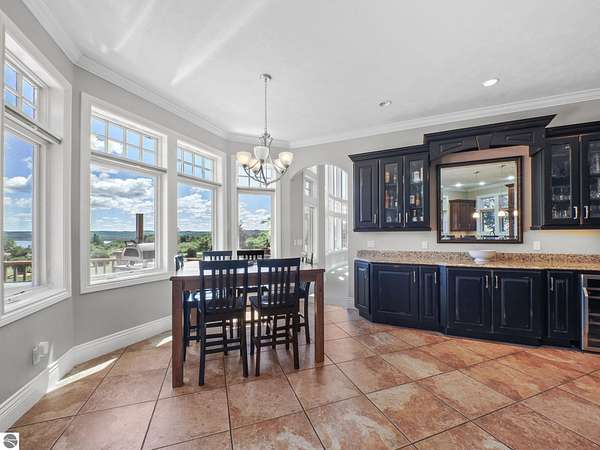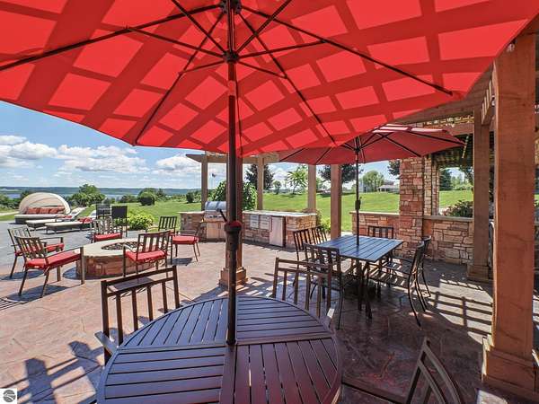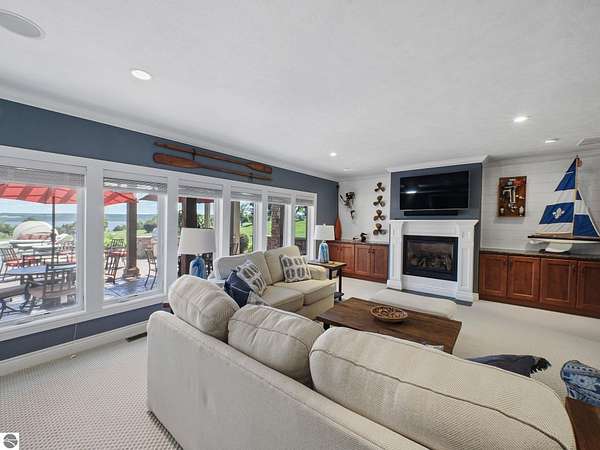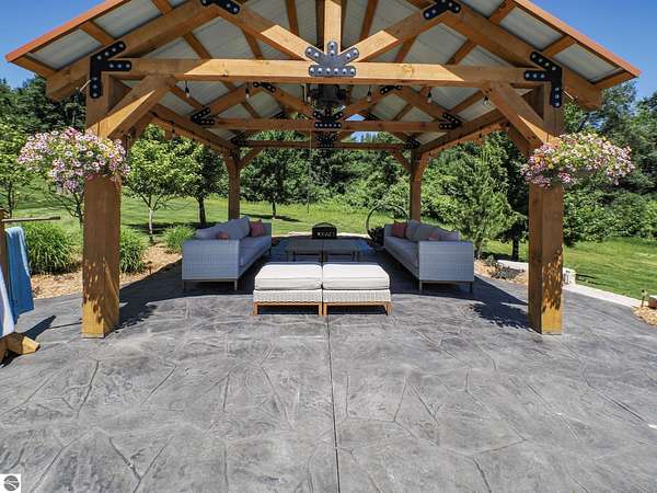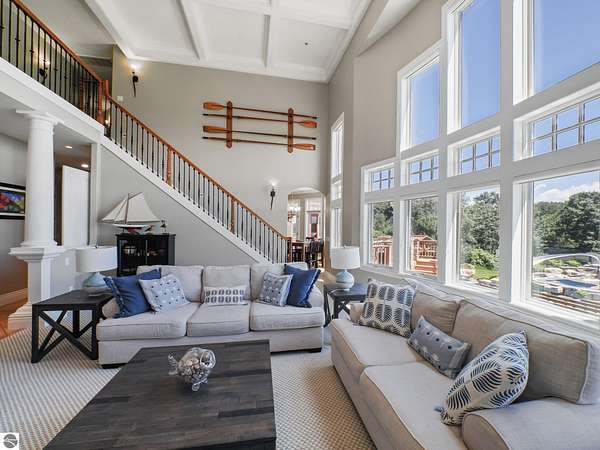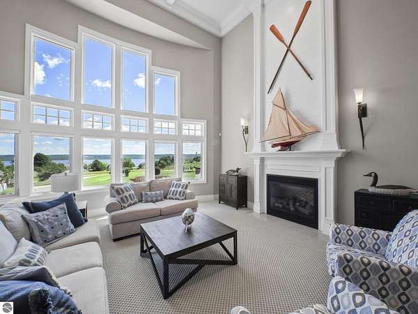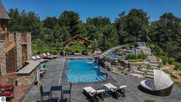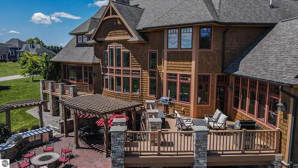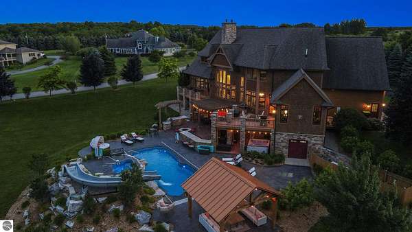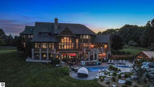 Amazing, customed-designed home situated on 9+ acres with expansive views of Lake Skegemog. The well designed floor plan and architectural details highlight this property. Gourmet kitchen with granite countertops and custom cabinetry. The formal living room features a fireplace and stunning views of Lake Skegemog. The main floor primary suite has luxurious features. The upper level has three en-suite bedrooms. The walkout lower level features a second kitchen, family room, fitness room, and sauna. Enjoy entertaining outdoors with the stunning pool surrounded by the patio, outdoor kitchen, and professional landscaping. Additional 30x40 insulated workshop/storage building with an RV outlet. Located near Traverse City and Elk Rapids. And just a short drive to the Flintfields Equestrian Center.