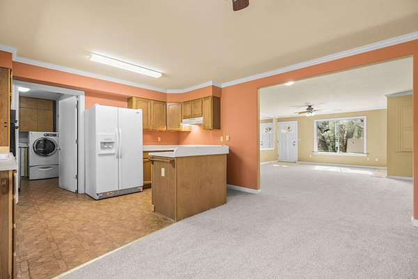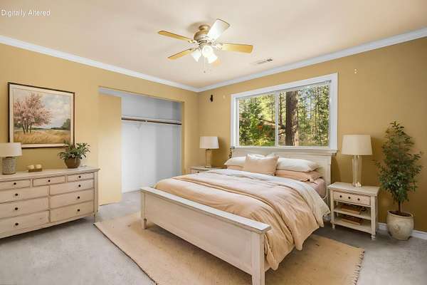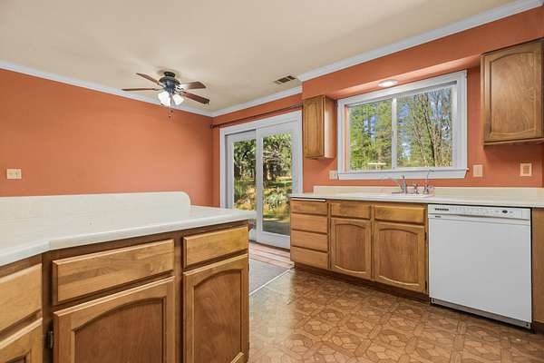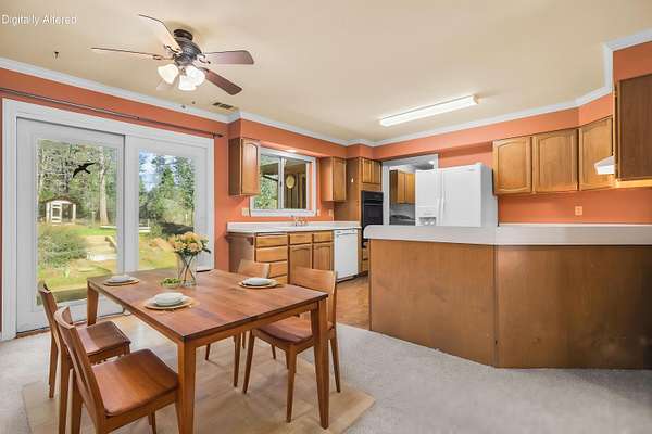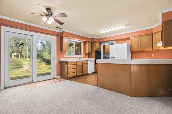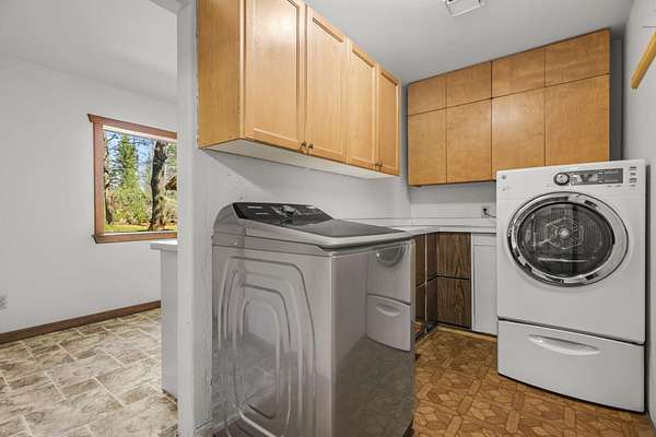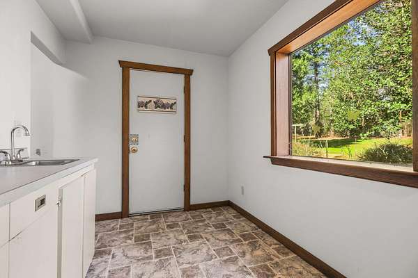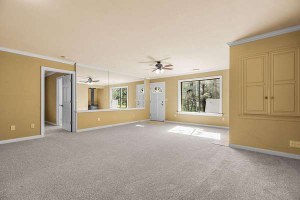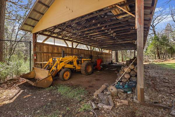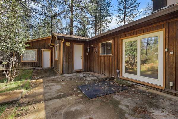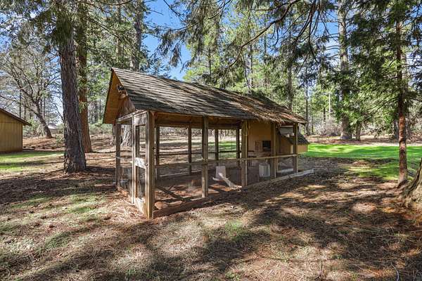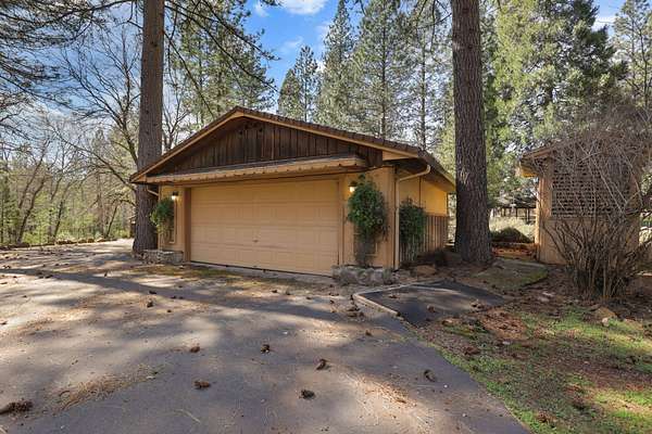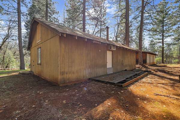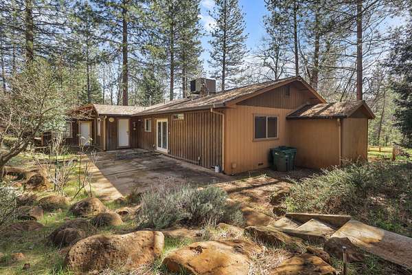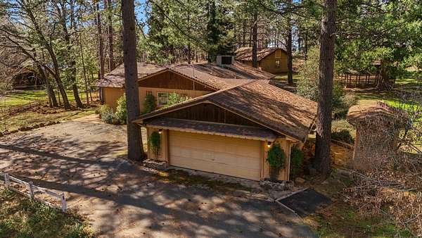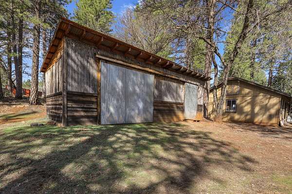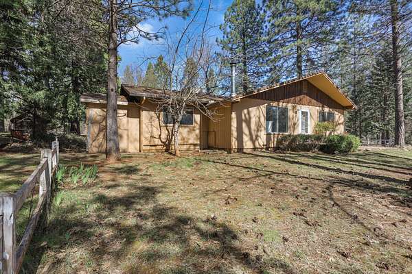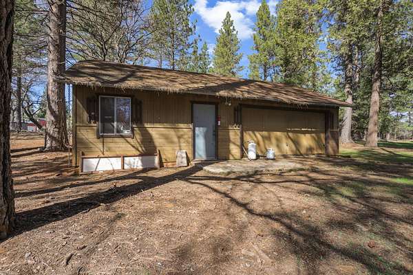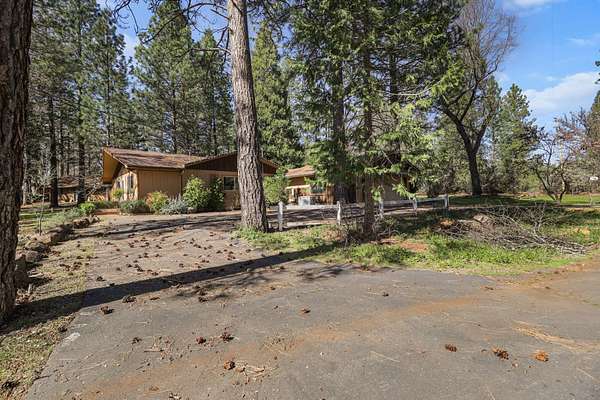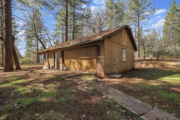 Nestled among mature pines on a peaceful, park-like setting, this charming single-level home offers privacy, space, and a true sense of retreat. Surrounded by natural beauty, the property features a welcoming exterior with rustic wood accents, expansive view windows, and a spacious paved driveway with ample parking. Inside, you'll find a light-filled layout with large windows that bring the outdoors in, creating a warm and inviting atmosphere. The generous lot provides room to roam, garden, or simply relax beneath the trees. An outbuilding offers additional storage or workspace potential, and the open yard space is perfect for entertaining, hobbies, or enjoying the serene setting. This property delivers the perfect balance of comfort and nature.