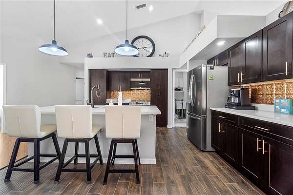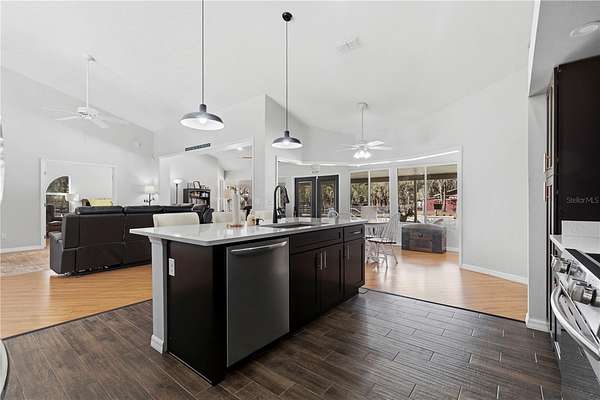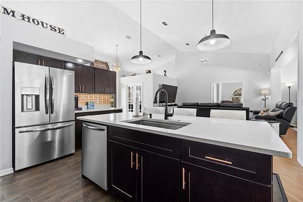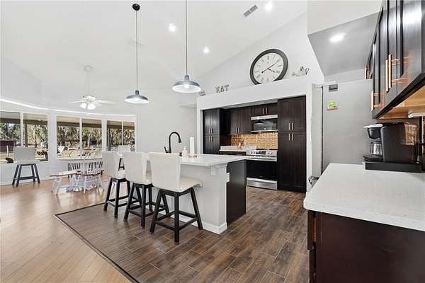 The primary residence offers 3 bedrooms, 2 bathrooms, and a flexible office space, all thoughtfully updated. The fully renovated kitchen shines with quartz countertops, brand-new stainless steel appliances, custom cabinetry with copper hardware, a designer backsplash, and a large center island. The open living area flows seamlessly to an expansive covered lanai overlooking a private resort-style pool with a waterfall, perfect for entertaining or relaxing in total privacy. Major upgrades include a 2023 HVAC, 2021 water heater, 2-year-old well pump, and a durable metal roof (2009). Additional features include an RV port, a carport, and three storage sheds, two have electricity, and one has water.