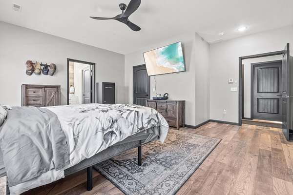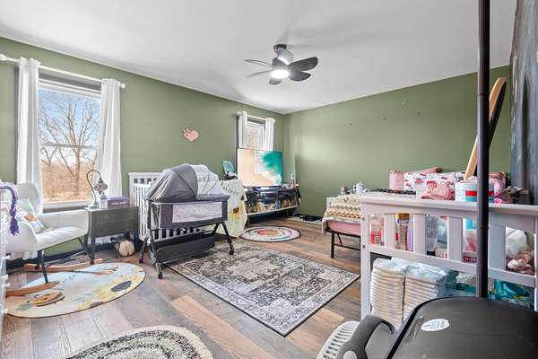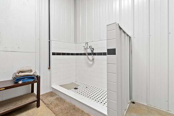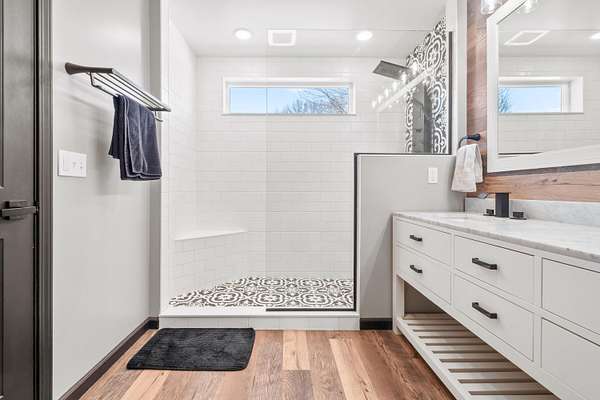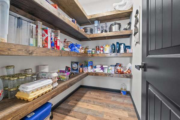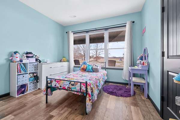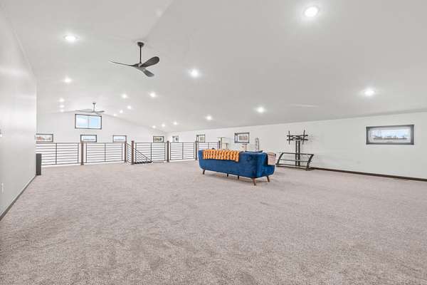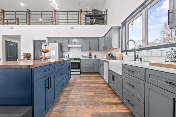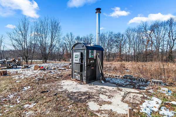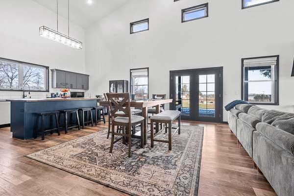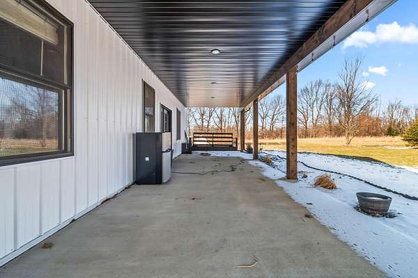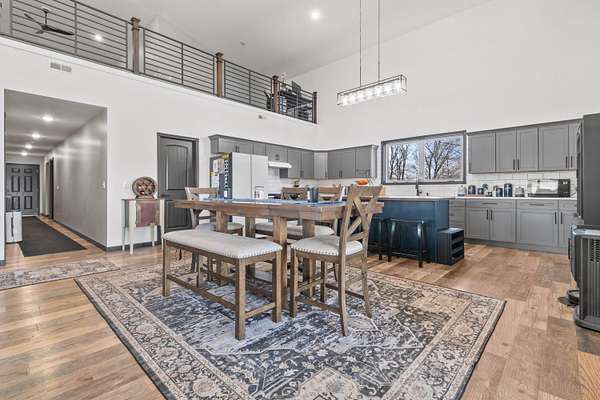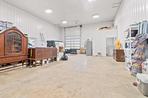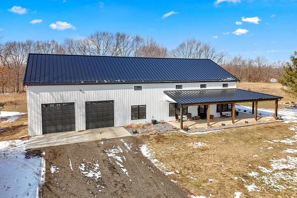 Luxury Barndominium Estate on 5.9 acres offering approx. 3,400 finished sq ft plus oversized commercial-grade shop. The open-concept main level features soaring ceilings, clerestory windows, and a dramatic great room flowing into the entertainer's kitchen with oversized island and abundant cabinetry. The primary suite includes a large walk-in closet and spacious bath with tiled double-sink vanity and walk-in shower. Two additional bedrooms share a Jack-and-Jill bath, plus separate guest half bath. Upper loft provides flexible living space. In-floor heat and outdoor wood burner add comfort and efficiency. Expansive wraparound covered porch and large concrete patio enhance outdoor living. Low-maintenance exterior. Dedicated dog wash room in shop. Massive shop with tall ceilings and oversized overhead door offers exceptional versatility.