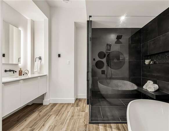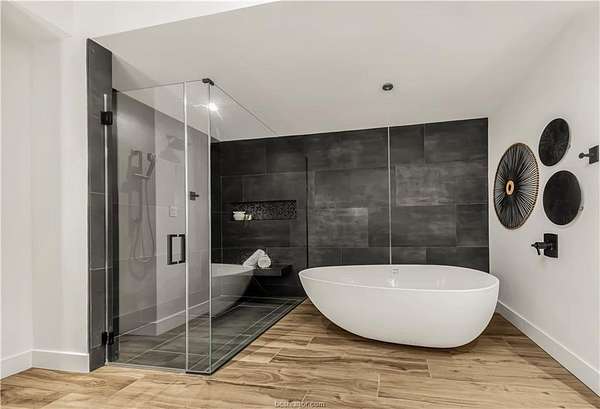 STUNNING ARCHITECTURAL RETREAT ON 12 ACRES! No expense has been spared in this never-lived-in, one-of-a-kind 12-acre retreat nestled among rolling, tree-covered hills. This architectural masterpiece features a modern exterior with Brazilian charred cedar siding, a 22-gauge metal roof and wall panels, and separate His and Hers garages with epoxy flooring. Inside, massive Western Window sliding doors flood the open living, dining, and kitchen areas with natural light. The living room centers around a floor-to-ceiling Isokern wood-burning fireplace, while the show-stopping kitchen boasts a beveled-waterfall island, exclusive Poggenpohl cabinetry, a 48" Cafe range, custom matte black vent hood, open shelving with lighting, and custom wood accents. The powder bath stuns with designer wallpaper, rare blue quartz counters, and backlit mirrors. The luxurious primary suite features motorized shades, designer wallpaper, a coffee bar, and a vast walk-in closet. Its resort-style bath offers Poggenpohl vanities, a large walk-in shower, and a massive standalone tub with a ceiling-mounted filler. A private screened-in porch includes a ceiling heater and backyard access. The split floorplan offers two more spacious bedrooms, designer baths, space for a home gym, a fully insulated quiet room or study, and dual laundry rooms. A whole-home audio system makes this home perfect for entertaining. This is Colorado-style living in Texas - Truly a once in a lifetime property!