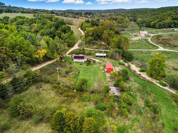 Ozarks Homestead with Solar Power, Creek Frontage & NO RESTRICTIONS!This charming Ozarks farm home has it all -- solar power, creek frontage, modern updates, reliable connectivity, and NO RESTRICTIONS -- on just over 3 acres! Enjoy Little Beaver Creek, rolling hills, and some of the best views in the county.The lodge-inspired interior features rustic reclaimed touches including an original barn door, tin roof accents, custom cedar cabinetry, and live-edge walnut countertops. The floor plan offers 2 main-level bedrooms, a primary suite with walk-in closet, plus a versatile loft for a 3rd bedroom, office, or craft space. A mudroom adds laundry and storage functionality for homestead living.🟢 Energy Efficiency:7KW Solar Panel System (avg. $30/month electric)Whole-house surge protection & transfer switchUpdated HVAC (2022)Modern underground electric service Exterior & Utilities:NEW RV Carport with 10x15 locking shed & 20/30/50 amp power post3-bay garage/machine shedSmall barn with paddock & squeeze chuteGreenhouse (parts included)Automatic tire waterer, garden beds, and established asparagus patchLarge covered deck with panoramic views8' carved bear statueCell Phone Booster & Fiber Internet -- stay connected in the country!This property blends Ozarks charm, modern solar efficiency, and complete freedom. Perfect for homesteading, raising animals, or private country living. Don't miss this one-of-a-kind, unrestricted Ozarks dream home!