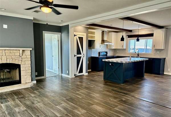 This 3 bedroom, 2 bath home has an extra family or tv room with a larger master and master bath, fireplace and open concept kitchen and main living room. It sits on over 5 acres in a quiet area.