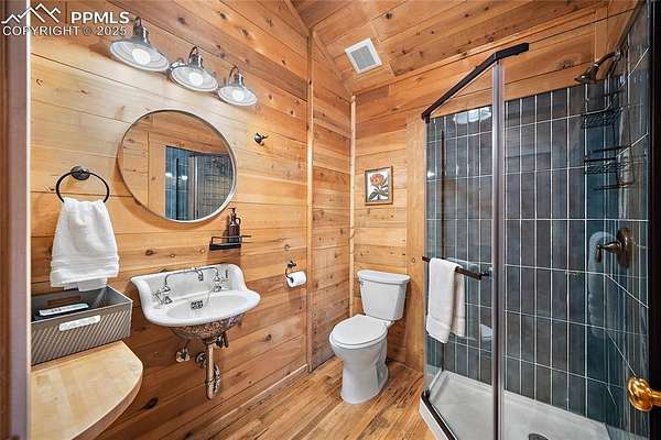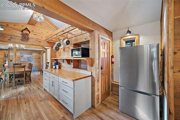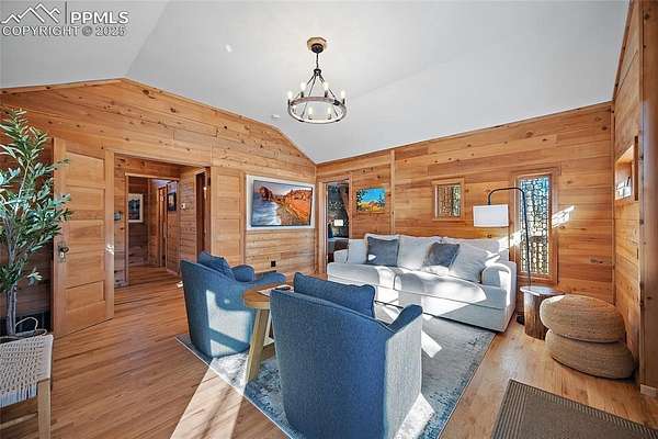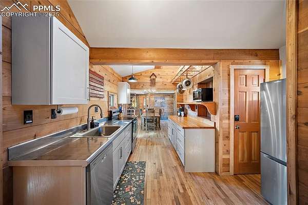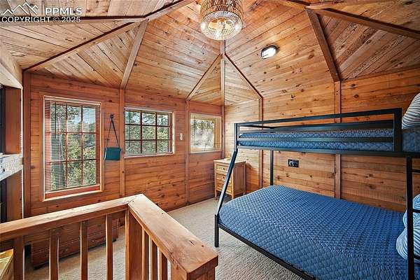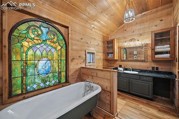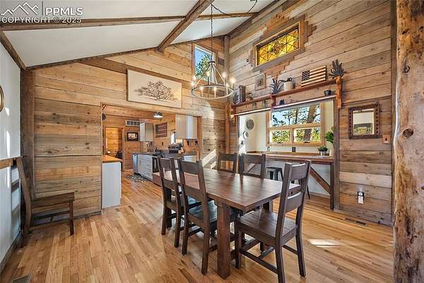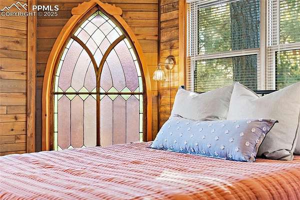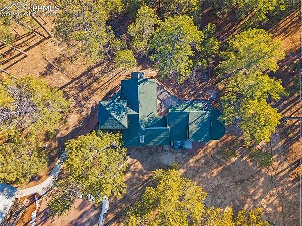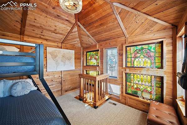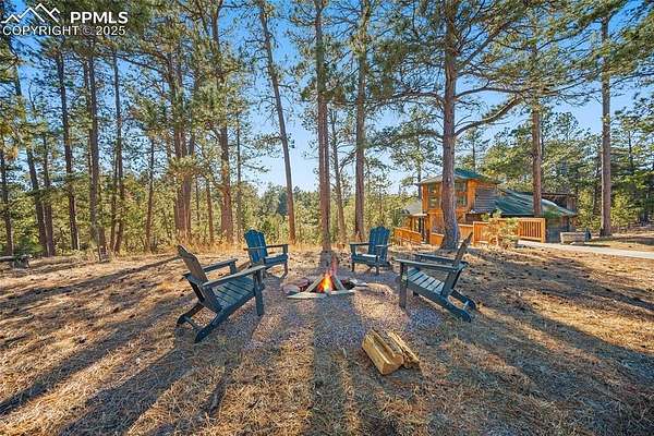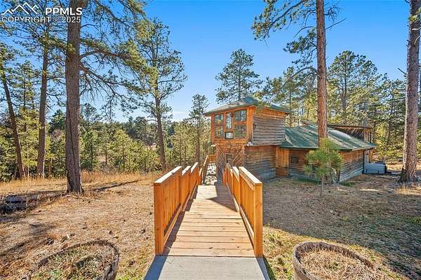 One-of-a-kind cabin retreat on 4.75 forested acres. This truly special property offers remarkable finishes and artistic elegance. Inside, wood-planked walls, rich hardwood floors, and abundant stained-glass windows create a warm and inviting atmosphere, with each stained-glass piece featuring its own unique pattern and color- absolutely magnificent. The kitchen is thoughtfully designed with stainless steel appliances and opens seamlessly to the dining area, where vaulted ceilings enhance the sense of space and light. A breakfast bar overlooks the surrounding forest, while the dining area offers a walk-out to the backyard. Two distinctive bedrooms are located on the main level, each with its own unforgettable character. One bedroom features direct access to the massive deck and provides easy entry to the upstairs loft. The second bedroom feels straight out of a castle, showcasing cathedral-style ceilings and stunning stained-glass windows. The luxurious full bathroom continues the home's artistry with stained-glass accents, a soaking tub, and a beautifully tiled walk-in shower. A sunroom offers additional access to the expansive deck-ideal for grilling, entertaining, or simply soaking in the breathtaking Colorado views. Upstairs, the loft welcomes you with an additional sitting area and bedroom, creating a peaceful retreat overlooking the main living space. Outside, the property is equally impressive with a detached garage/barn, fireplace, hot tub, and even an outhouse, all surrounded by serene forested acreage. Whether you're seeking a private getaway, vacation home, or a true Colorado lifestyle experience, this remarkable property delivers unmatched character, privacy, and natural beauty.