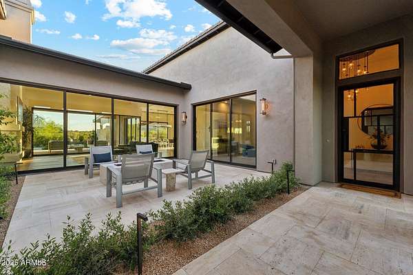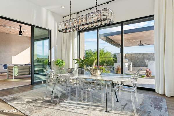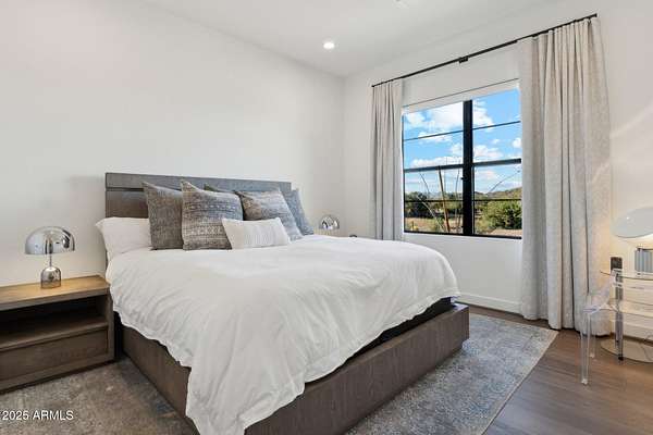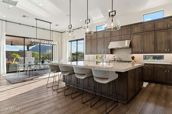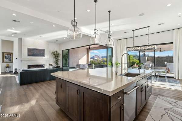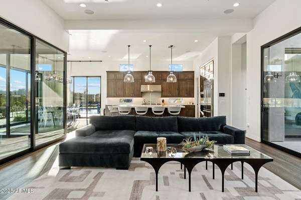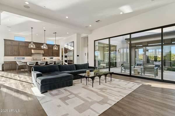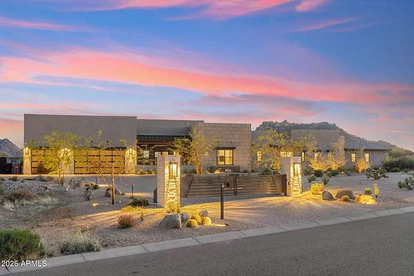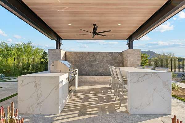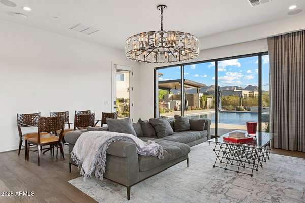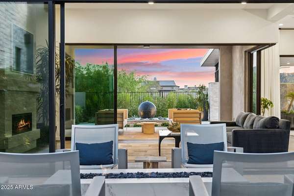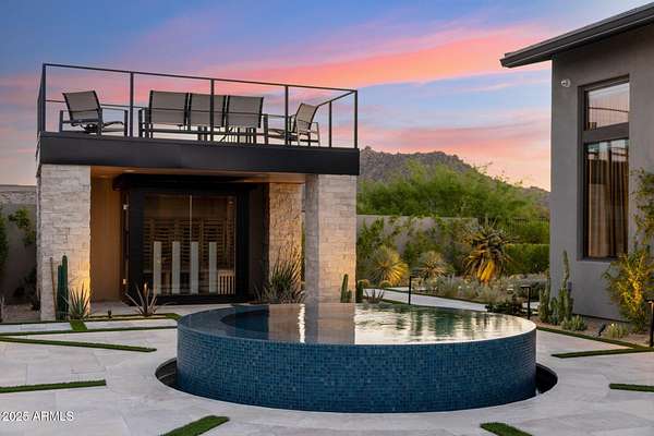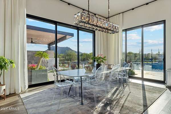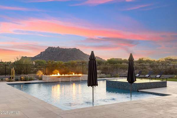 Experience elevated desert living in this newly constructed, sophisticated residence nestled in the heart of North Scottsdale. Showcasing sweeping panoramic mountain views, this exceptional home is designed for seamless indoor-outdoor living and effortless entertaining. The expansive open-concept great room is framed by dramatic walls of glass, flooding the space with natural light and highlighting custom lighting and high-end designer finishes throughout. The chef's kitchen is a true showpiece, featuring premium Wolf appliances, a Sub-Zero refrigerator, an oversized quartz waterfall island, and an additional Bosch refrigerator conveniently located in the garage-perfect for extended stays and entertaining. Step outside to your private resort-style oasis.