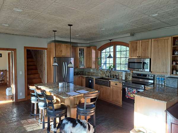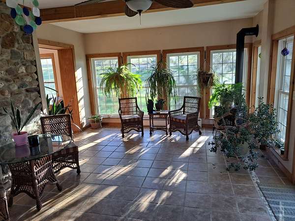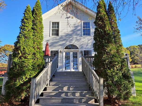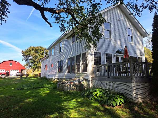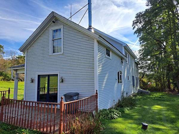 The farmhouse is an ~2,847 sqft home with 4 bedrooms and 3 full baths, which has been modernized over time, yet retains its rural character. Notable features include a grand fireplace and hearth, modern kitchen and dining area, sunroom, and secluded deck.