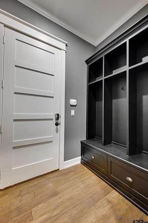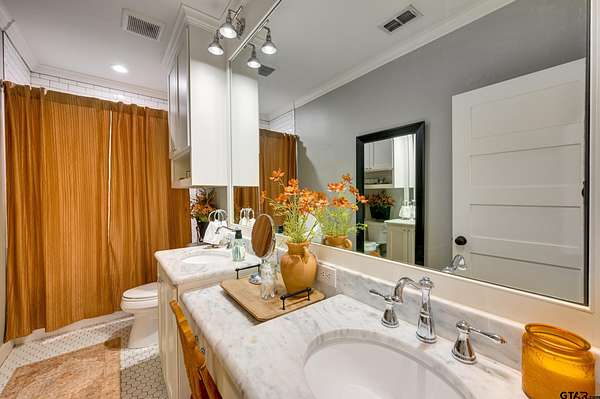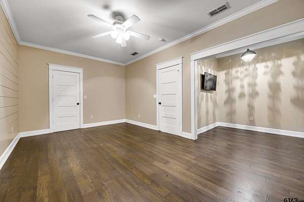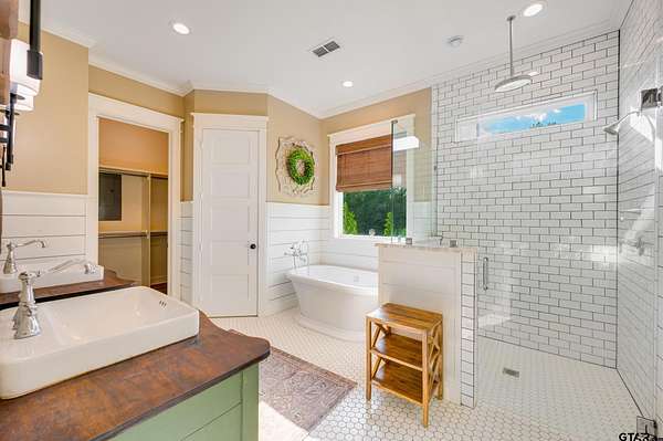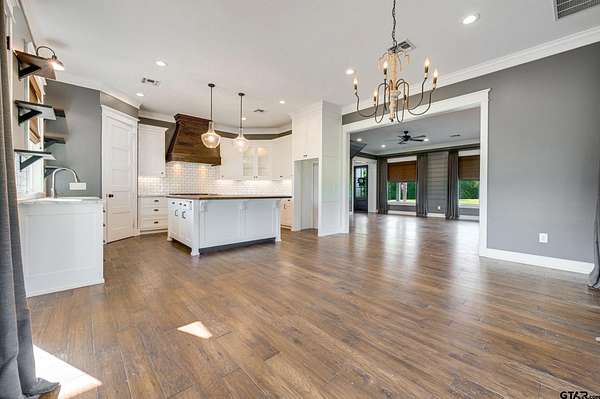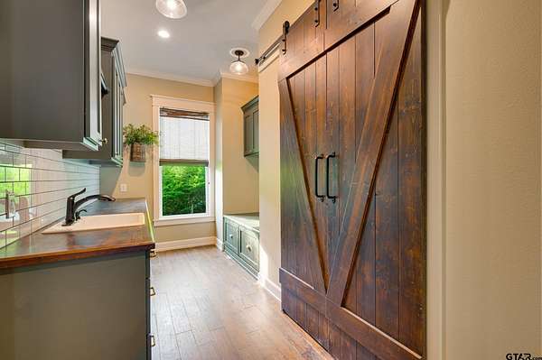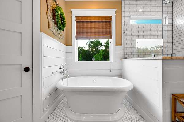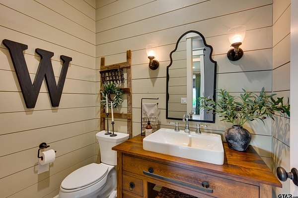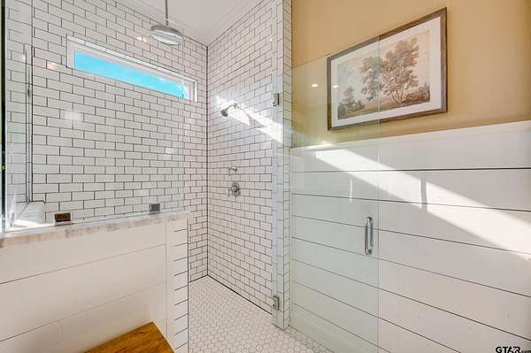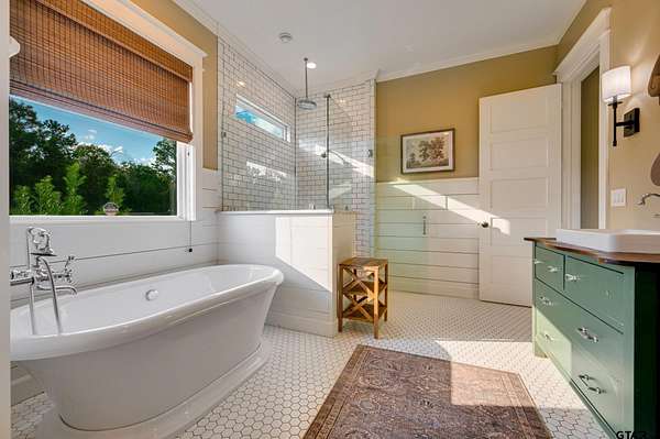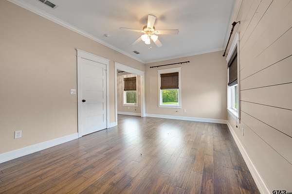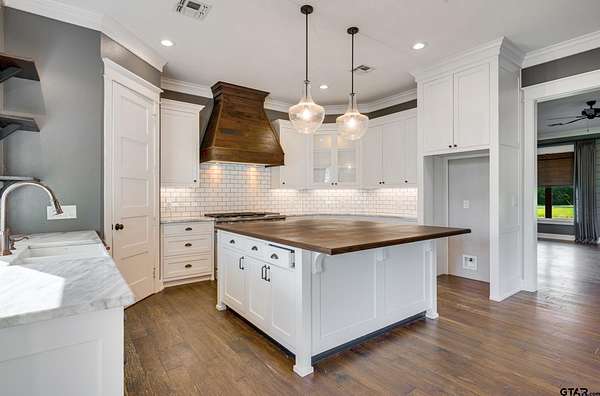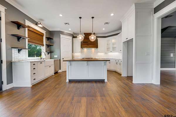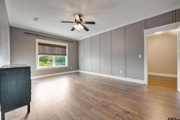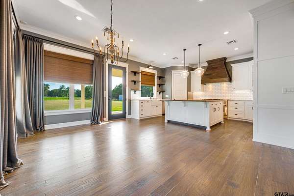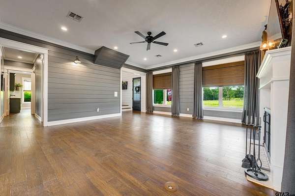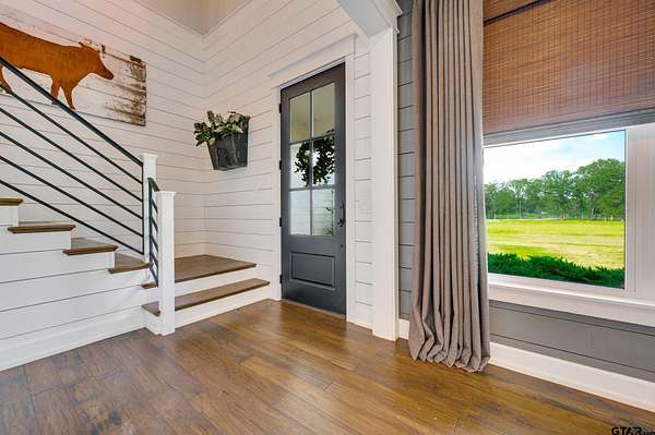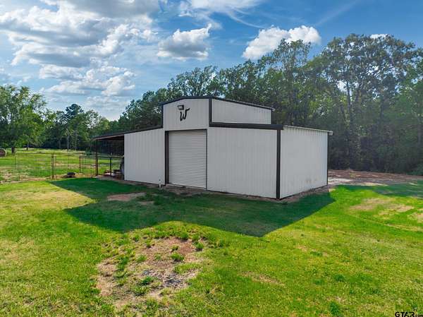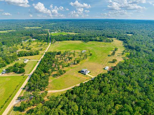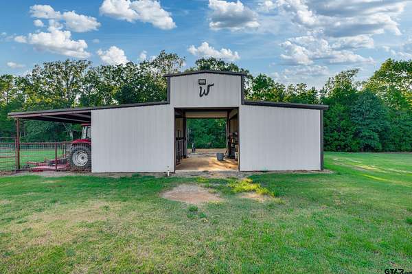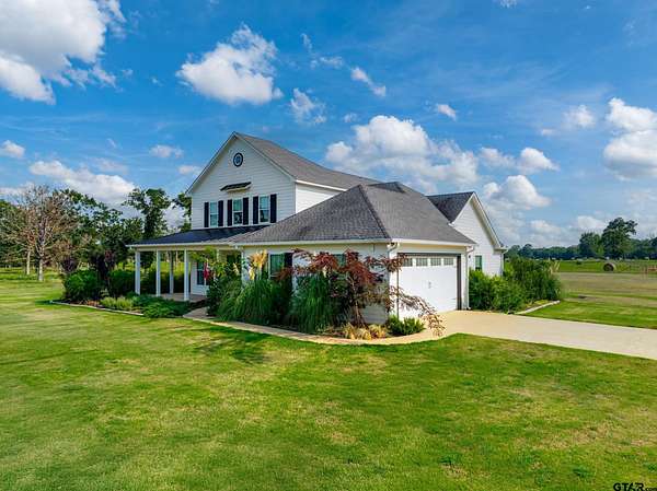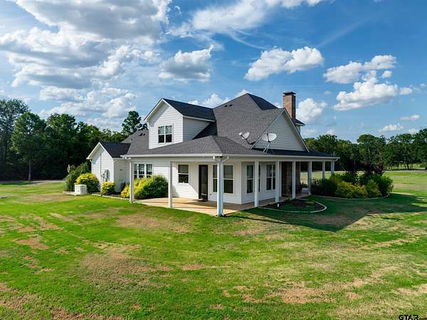 Discover this 3119 sq. ft. custom farmhouse-style home built by Harris Building Company, perfectly situated on 44+ acres in the rolling hills and trees of East Texas. Enter the electric gate and drive toward this thoughtfully designed home with welcoming front porch. Step inside to find an inviting open living area with fireplace, dining area and a well-appointed kitchen featuring a large island with stained wood counter, marble counters, farmhouse sink, premium appliances, generous built-in cabinetry & pantry. Window treatments and wood shiplap accent walls throughout the home add warmth and timeless character. The light filled primary bedroom, located downstairs, has spa bath including soaking tub, shower, separate custom sinks, walk-in closet and tile flooring providing privacy and comfort. Spacious guest bedrooms and inviting guest bath are located upstairs. Outdoors, you'll find a 40' x 30' barn with concrete floor and two dirt runs, ideal for livestock or equipment. A whole-house generator with 1000-gallon propane tank provides peace of mind in any weather. Enjoy serene views from the covered back patio overlooking open pastures and the surrounding countryside. A pond provides access to water for livestock. The property is fully fenced with an electric entrance gate for privacy and security. A rare combination of craftsmanship, functionality, and natural beauty--this property offers the best of East Texas country living.