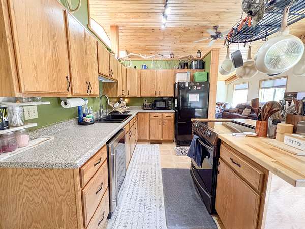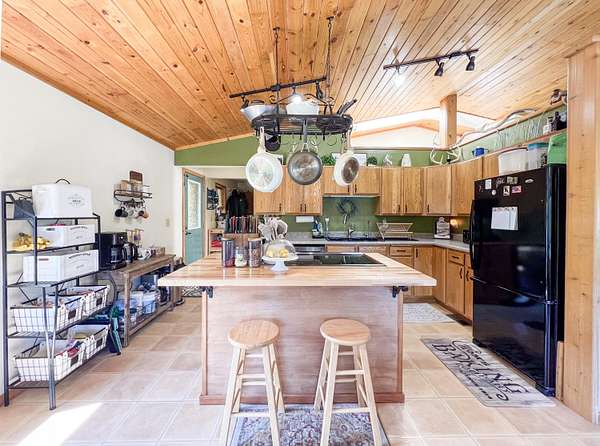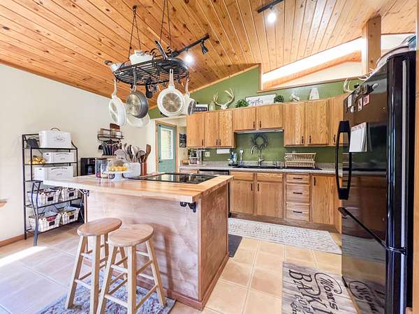- Ceiling Fans, Island, Sky Light, Tile Floors, Wood Floors