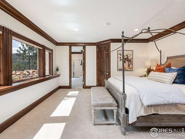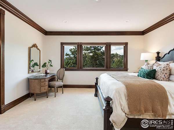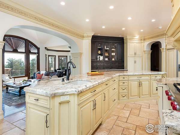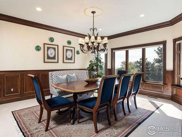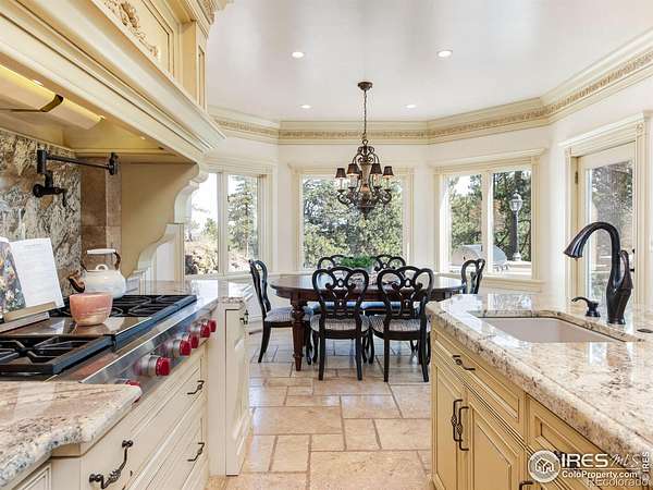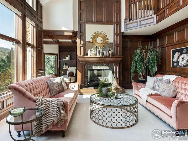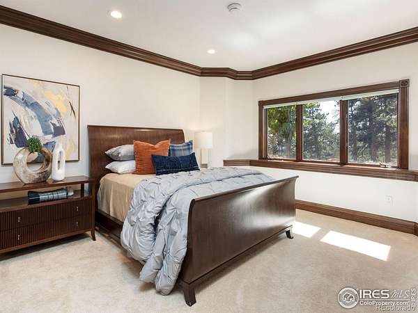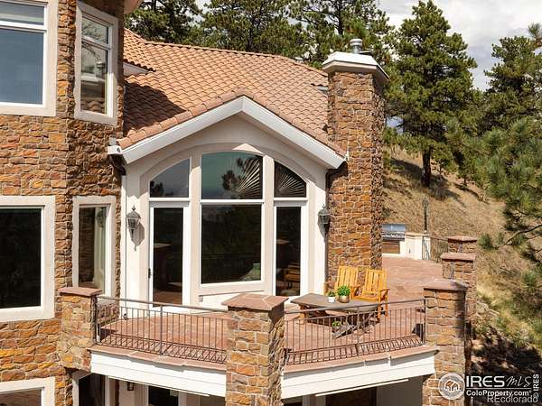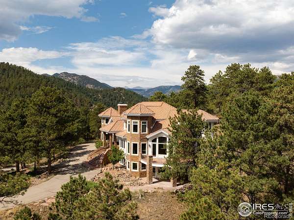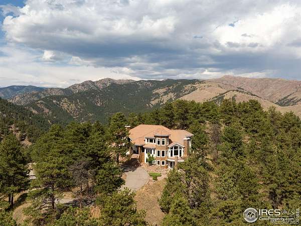Nestled in Buckingham Hills, this exclusive luxury mountain estate is just 14 minutes from downtown Boulder. On 35 acres and bordering national forest, it offers stunning views and access to over 300 acres of private open space. A lighted private drive leads to a circular drive, blending natural beauty with refined living. Inside, the 7,825 sq.ft. custom home welcomes you with soaring ceilings and marble foyer. The formal living room features a fireplace, vaulted ceilings, and custom paneled walls. Adjacent, the circular library's floor to ceiling windows frame the city's twinkling lights. The formal dining room, with built-in cabinetry, seamlessly connects the family room and chef's kitchen. An elegant European inspired gourmet kitchen boasts custom cabinetry with inserts, Wolf range with pot filler, Sub-Zero fridge, double wall ovens, granite surfaces, travertine flooring and a walk-in pantry. It opens to a wraparound flagstone patio with built-in BBQ. The connected family room has vaulted ceilings, walnut floors, fireplace, breakfast nook and wet bar, flowing out to the patio. A marble powder room and laundry complete the main level. The primary suite offers high ceilings, a reading library and views. It's en-suite bath includes marble finishes, dual walk-in closets and vanities, a bidet, jetted tub and a large shower with body sprays. A peaceful private study is nearby with built-ins. An en-suite guest bedroom on it's own level includes a cozy reading room with captivating views. Luxurious living continues on the lower level with a rec room complete with wet bar and fireplace, a media room with Murphy bed, a home gym and two ensuite guest bedrooms. Attached and heated 4 car garage with cabinetry. Flagstone patios, radiant floor heat, intercom system, central vacuum & new modern can lighting. World class hiking and biking just out your door. This estates blends nature, luxury and proximity to downtown making it an idyllic retreat for adventure and culture.