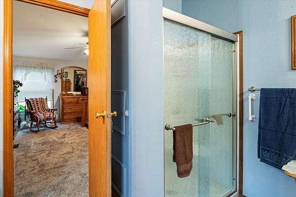 - Ceiling Fan(s), Double Vanity, Fiberglass Stall Shower, Laminate Counters, Linen Closet, Open Floorplan, Pantry, Primary Downstairs, Shower/Tub Combo, Smart Thermostat, Vaulted Ceiling(s), Walk-In Closet(s)